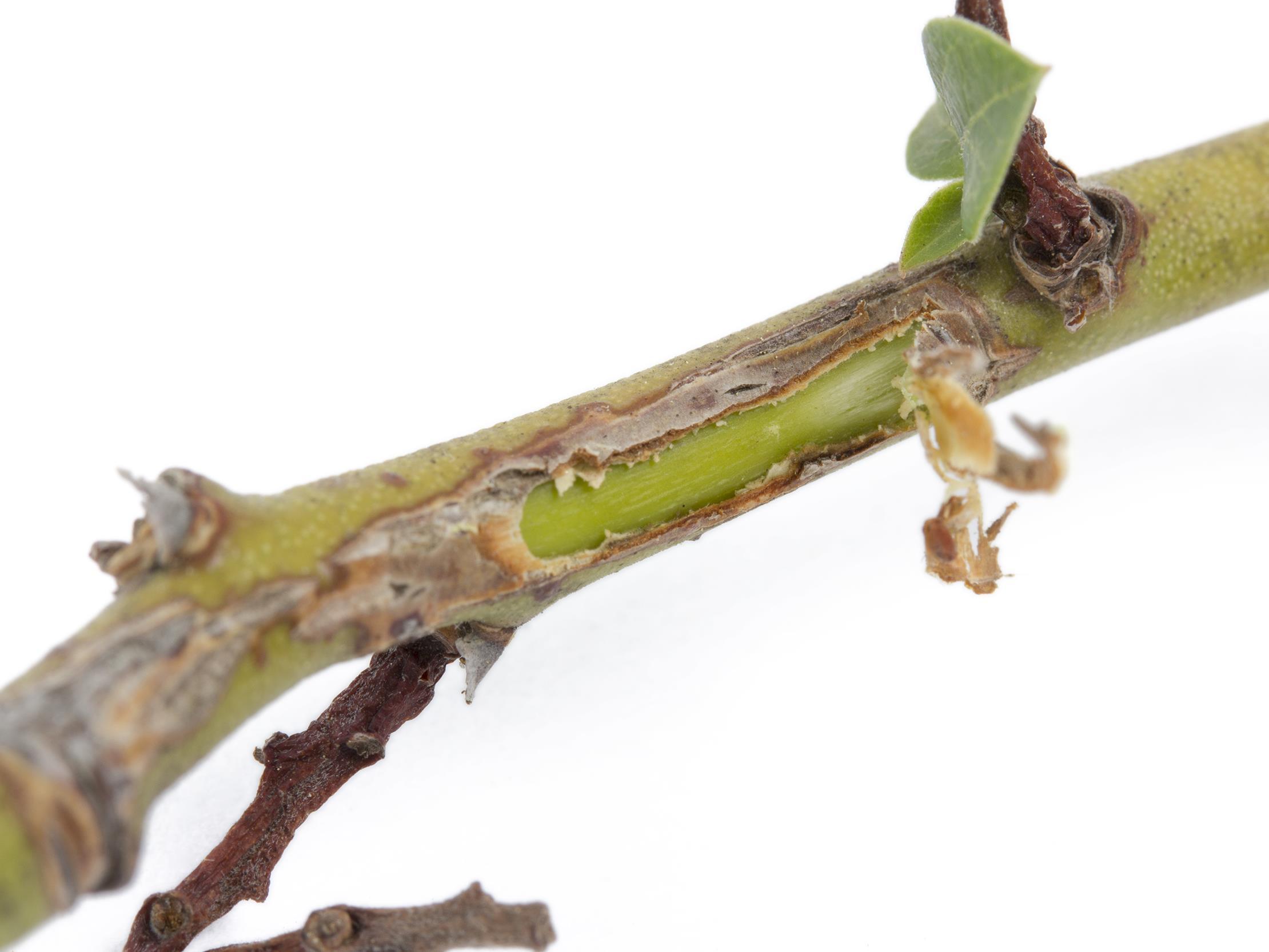 Description: Sur une tige de bleuetier en corymbe, on observe un long chancre rougeâtre. L’épiderme de la tige a été coupé au centre du chancre, laissant voir que la lésion est superficielle et n’atteint pas les tissus internes de la tige. Les tests de laboratoire ont révélé la présence du champignon Fusicoccum putrefaciens, responsable du chancre à Fusicoccum chez le bleuet en corymbe.