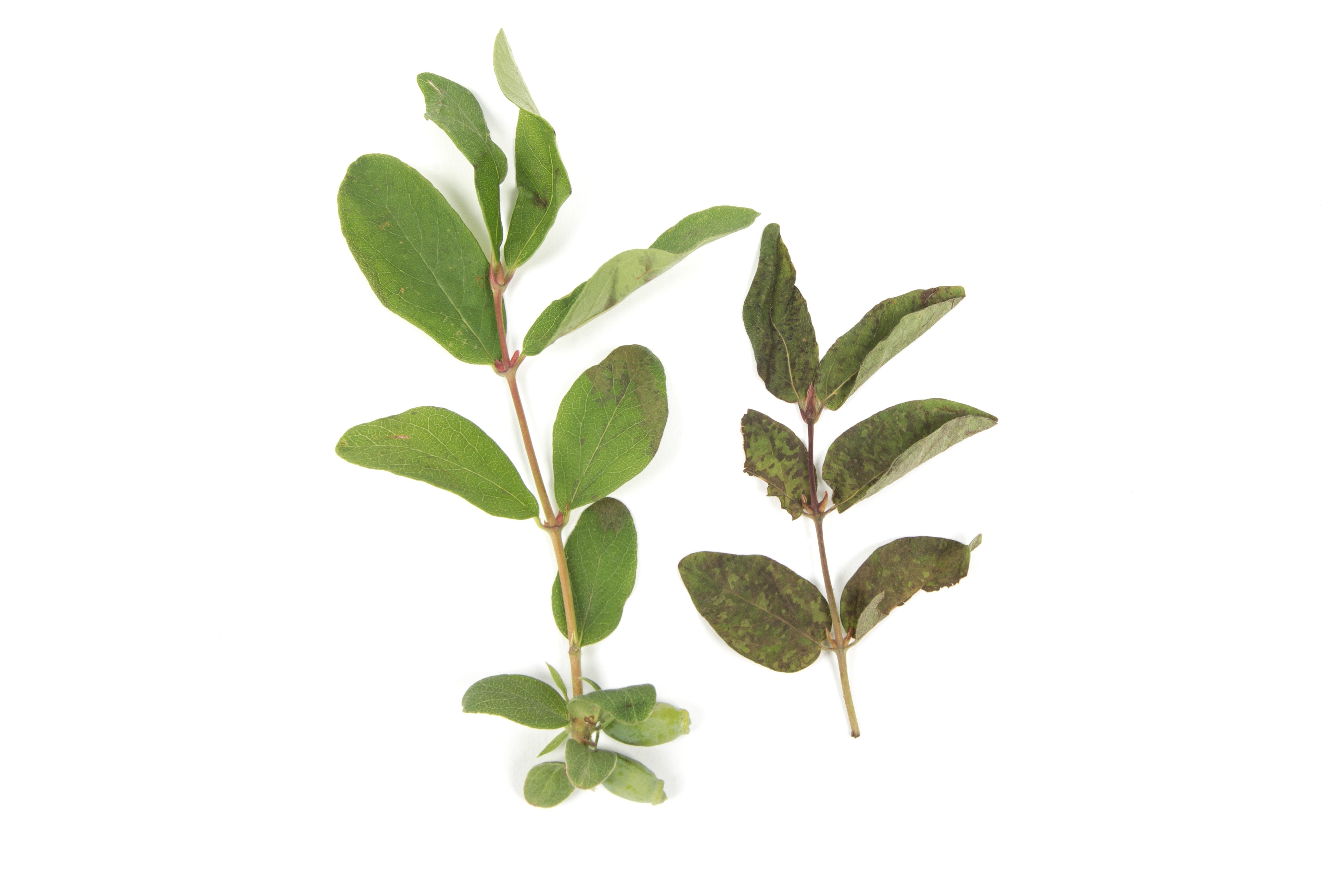 Description: La tige d'un plant de camérisier, à gauche sur l'image, montre des feuilles dont le degré de dommage est beaucoup moins sévère que celles de la tige située à droite. Les feuilles touchées de cette dernière tige montrent des taches sans halo (brûlures de contact), distribuées aléatoirement sur le limbe et visibles sur la face inférieure. Elles sont diffuses à certains endroits et plus prononcées à d'autres. Ce symptôme a été causé par l’application de bromoxynil (ester) à proximité des camérisiers (dérive de produit). Cet herbicide de contact est entre autres utilisé pour éliminer les feuilles larges dans les céréales et le maïs et n'est pas homologué pour la culture des petits fruits, dont celle de la camerise. Le dosage chimique réalisé a montré la présence de l’herbicide à une faible concentration, toutefois suffisante pour causer des dommages. La brûlure évolue en nécrose sur les tissus atteints mais les nouvelles feuilles ne sont pas affectées. L'herbicide ne migre pas dans la plante; les brûlures n’apparaissent que sur les parties touchées.