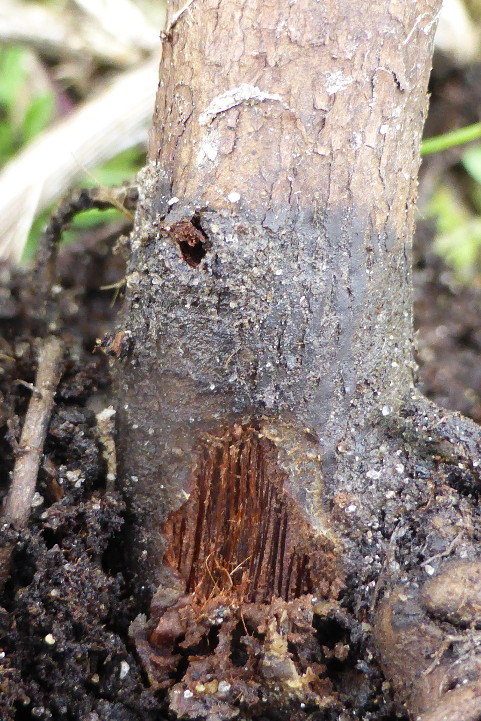 : Chancre noir et visqueux au niveau du collet d’un jeune plant d’argousier.