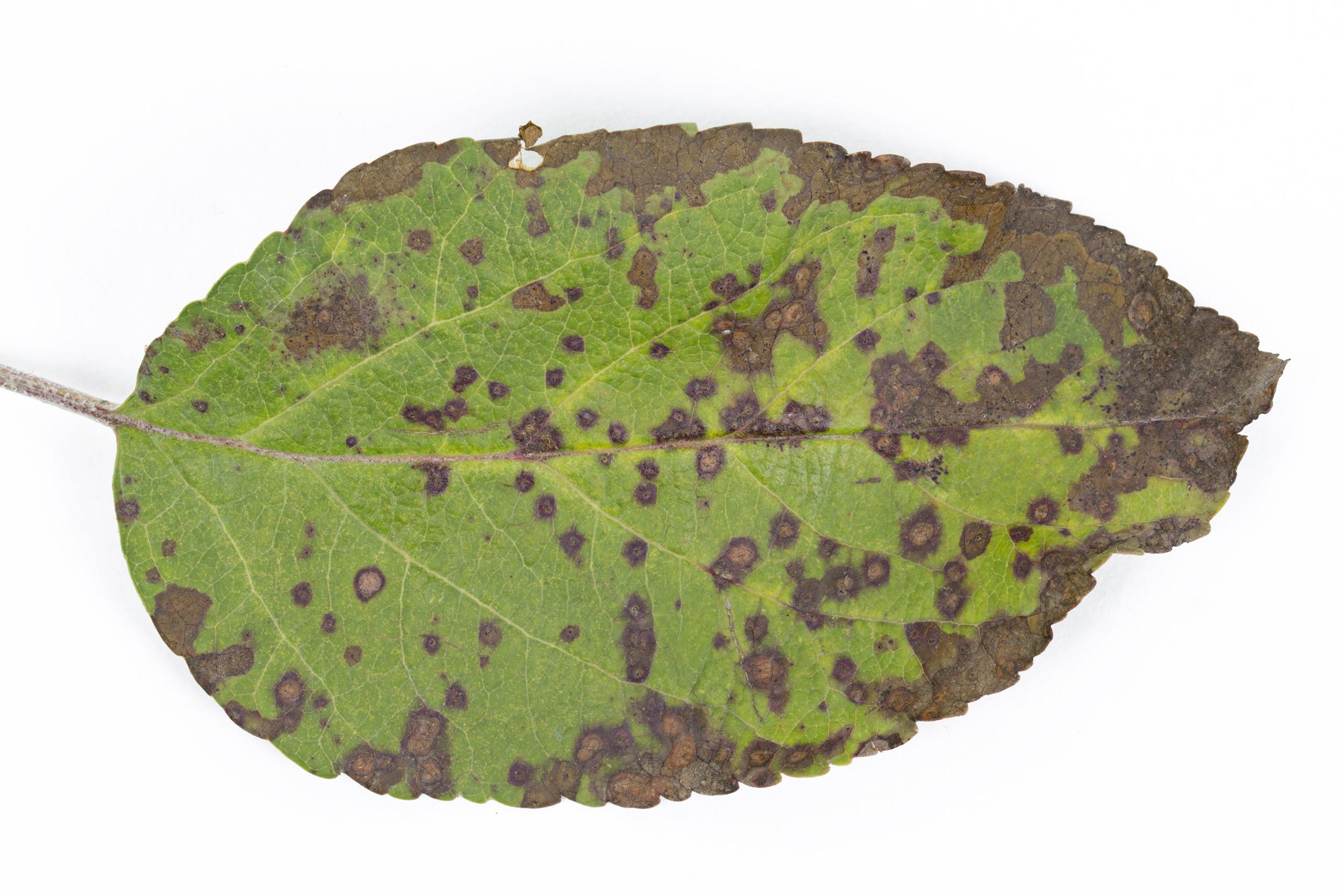 Légende: Taches causées par Diplocarpon coronaria sur une feuille de pommier.