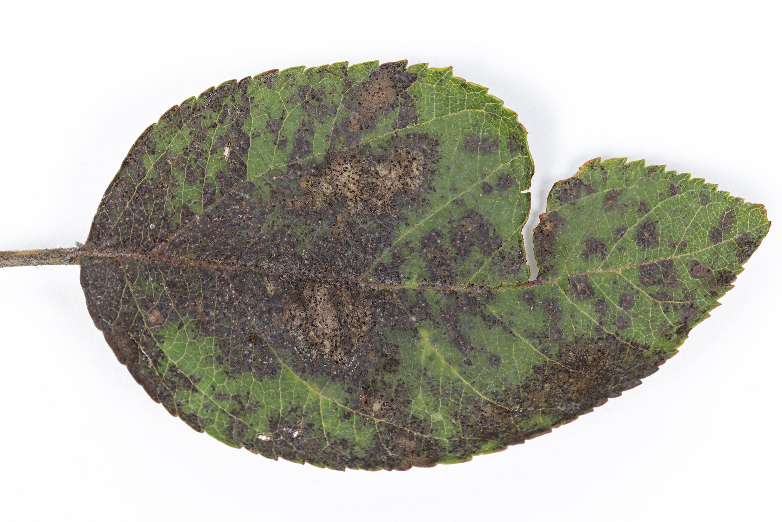 Légende: Taches causées par Diplocarpon coronaria sur une feuille de pommier.