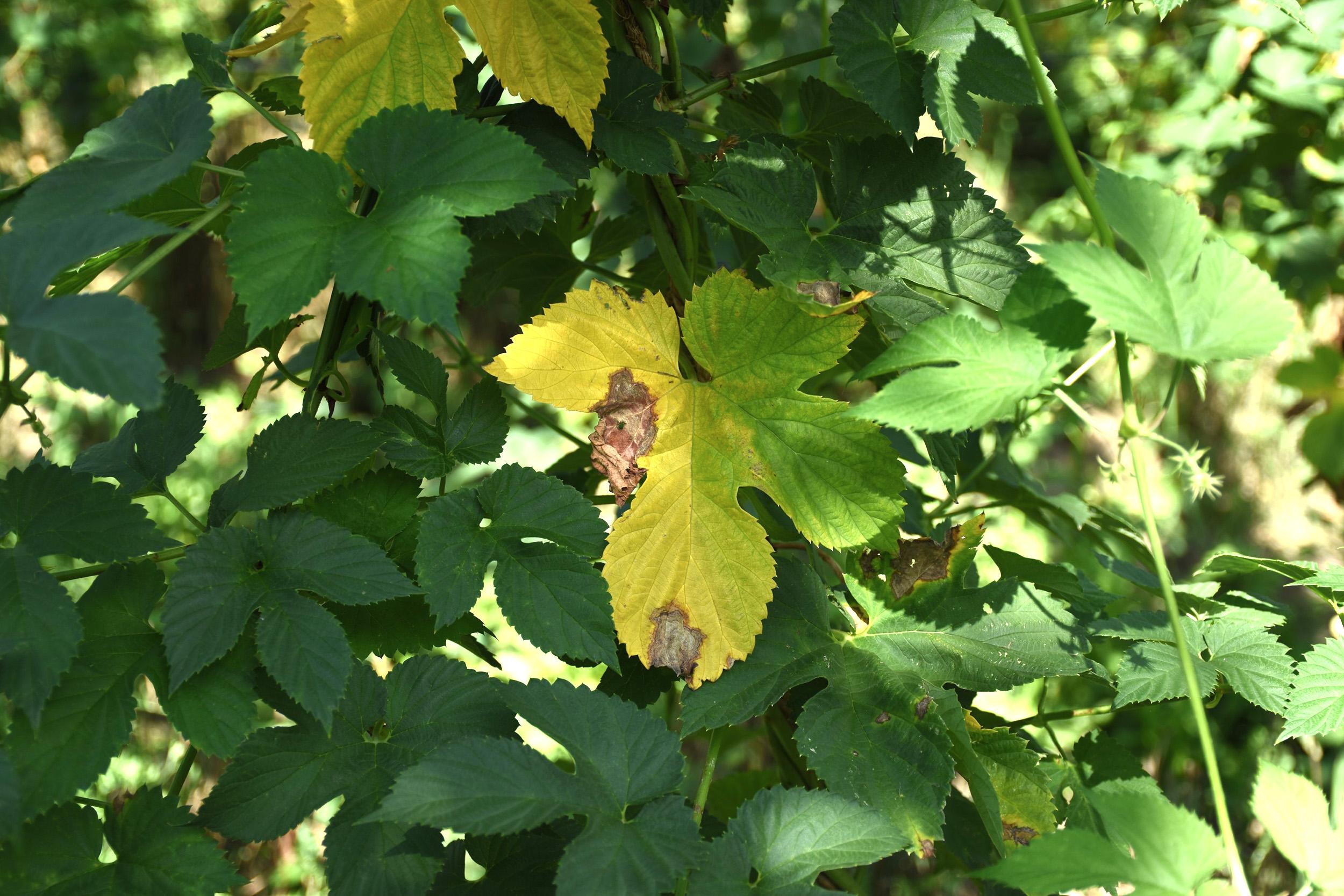 Légende: Lésion causée par la brûlure halo et chlorose sur une feuille mature.