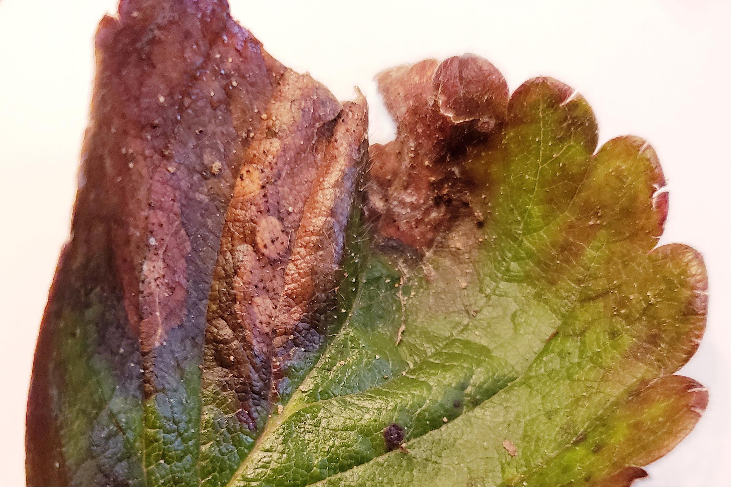 : Brulûre des folioles et présence de pycnides (structures fongiques) causées par Neopestalotiopsis spp.