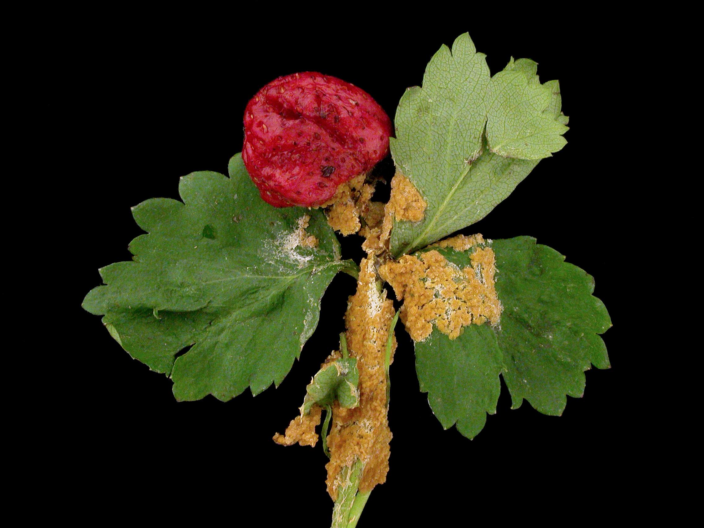 Légende: Fructifications fongiques orange sur fraisier