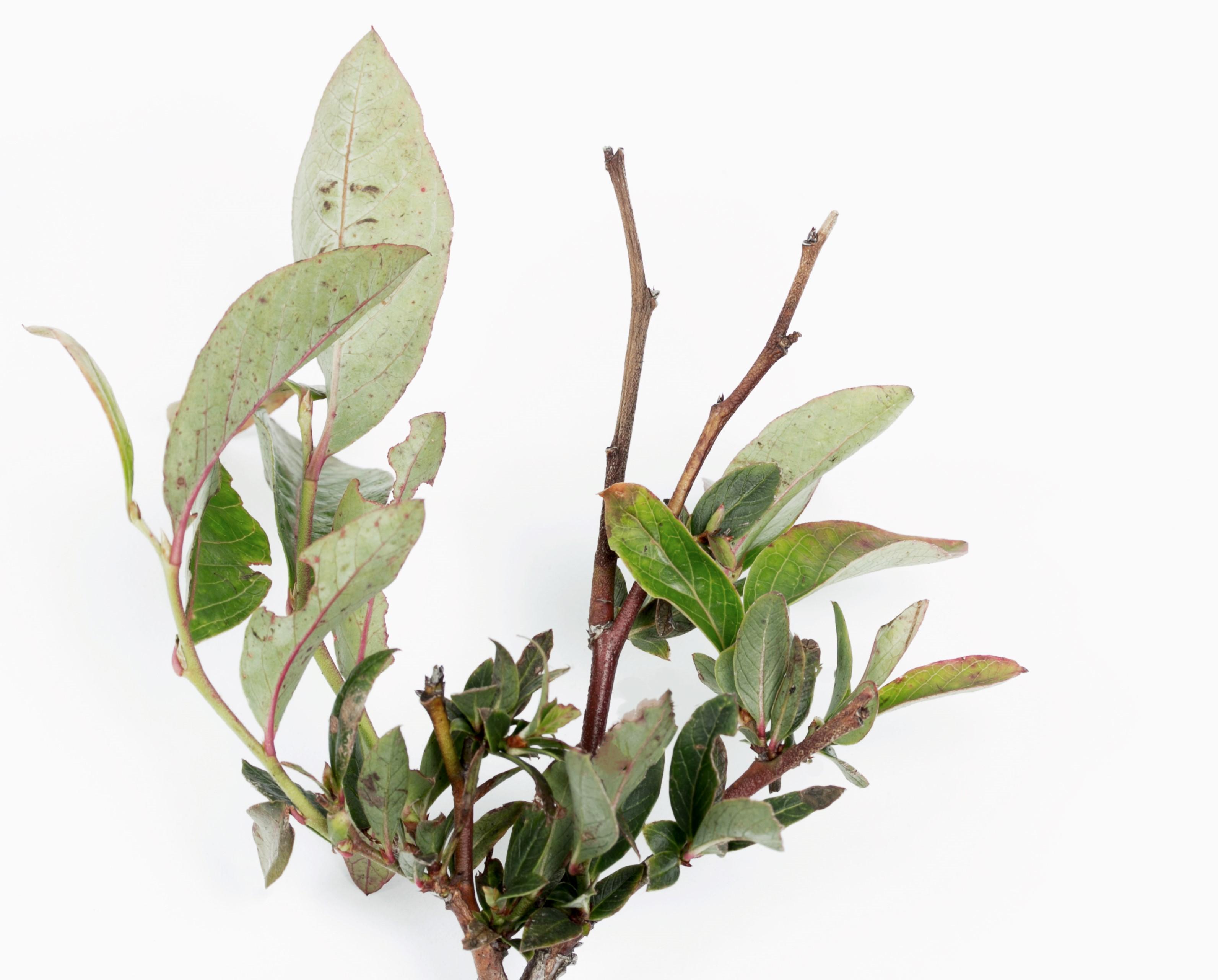 Description: Sur un plant de bleuet en corymbe, des malformations foliaires sont présentes. Elles se caractérisent par le développement de bouquets foliaires denses et compacts : les feuilles, effilées et de taille réduite, sont regroupées en rosette. Ces malformations sont accompagnées d’un rosissement à la marge des feuilles. Les symptômes observés sur l'échantillon s'apparentent à ceux généralement causés par le glyphosate, lors d’applications réalisées à l’automne précédent. Environ 80 % des plants sont atteints : ceci suggère une phytotoxicité due au glyphosate, appliqué dans les rangées. Des bactéries non phytopathogènes ont également été isolées des tiges des plants.