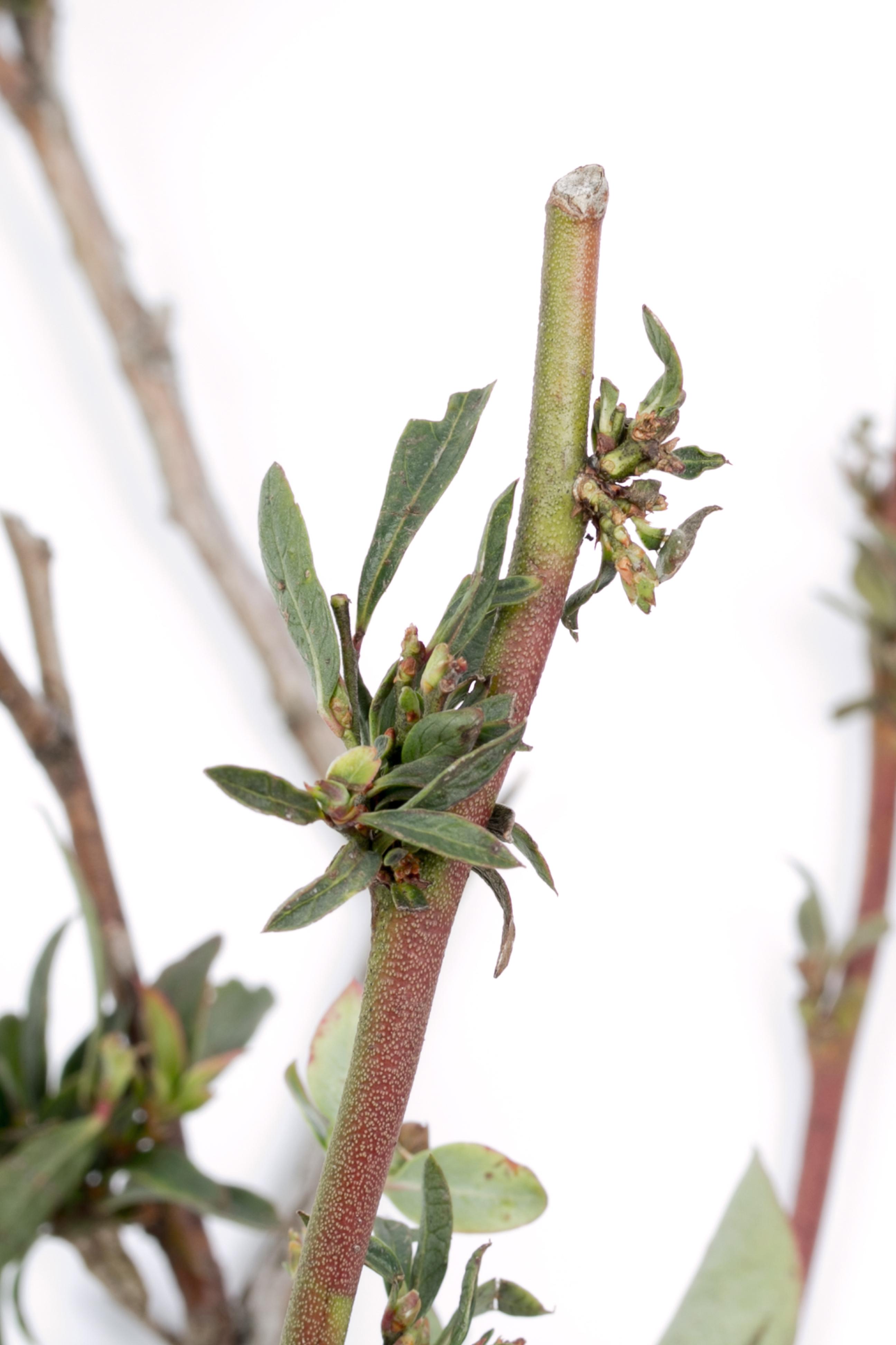 Description: Sur un plant de bleuet en corymbe, des malformations foliaires sont présentes. Elles se caractérisent par le développement de bouquets foliaires denses et compacts : les feuilles, effilées et de taille réduite, sont regroupées en rosette. Ces malformations sont accompagnées d’un rosissement à la marge des feuilles. Les symptômes observés sur l'échantillon s'apparentent à ceux généralement causés par le glyphosate, lors d’application réalisées à l’automne précédent. Environ 80 % des plants sont atteints : ceci suggère une phytotoxicité due au glyphosate, appliqué dans les rangées. Des bactéries non phytopathogènes ont également été isolées des tiges des plants.