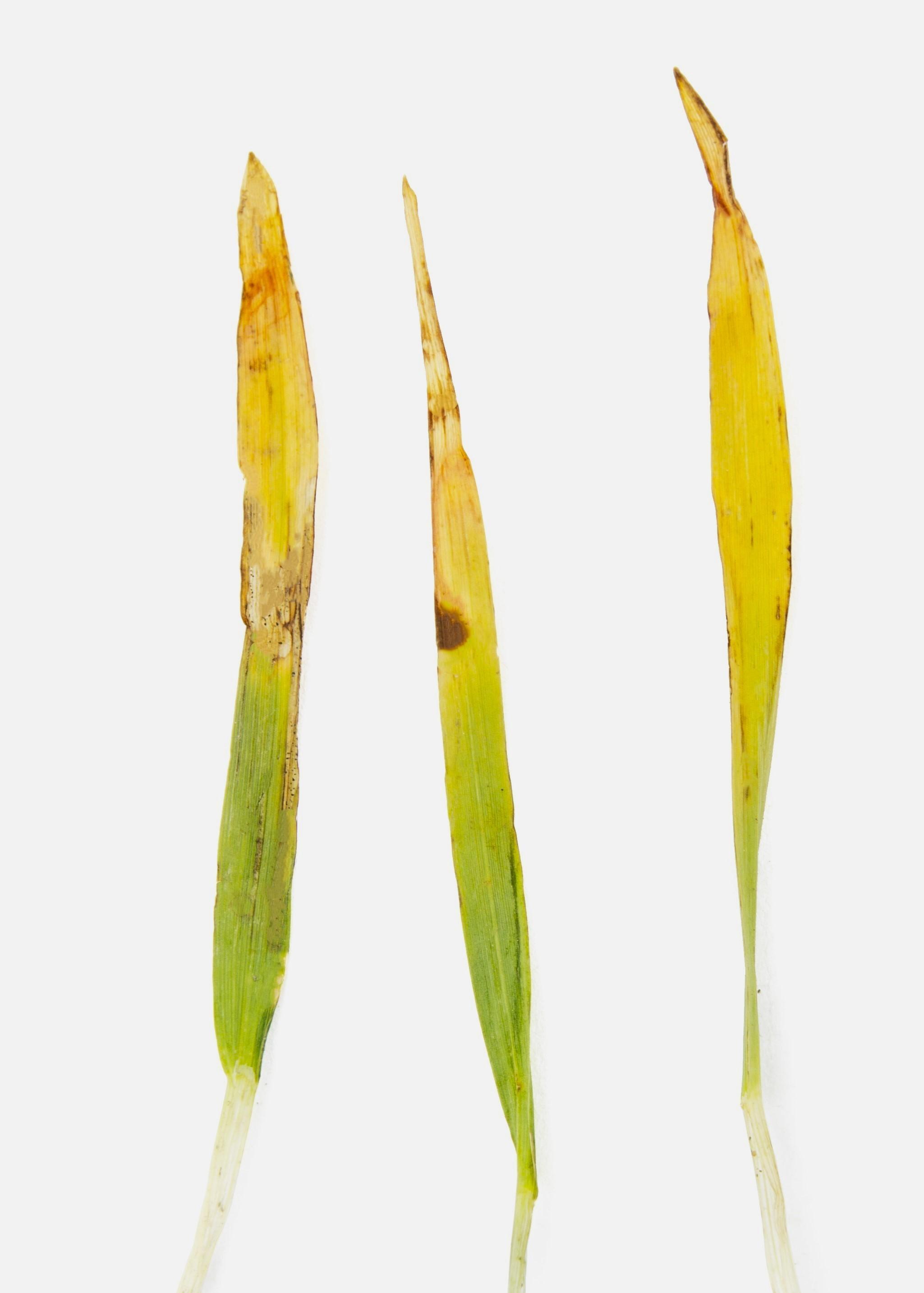 Description: Des feuilles basales d’orge montrent un jaunissement important, sur presque toute leur longueur, partant de l'apex vers la base du limbe. Tout le champ présente ces symptômes sur les plants. Un dosage chimique a permis de déceler la présence de fomésafène, en quantité suffisante pour causer des dommages sur la culture. Des traces de cyantraniloprole ont également été trouvées dans les tissus. Ces deux pesticides ne sont pas homologués dans la culture de l’orge. Les dommages observés sont liés au fomésafène qui provoque normalement un jaunissement (ou effet de bronzage) et/ou de petites taches sur les tissus des plantes sensibles avec lesquelles il entre en contact. Le jaunissement évolue vers un brunissement et la nécrose des zones touchées.