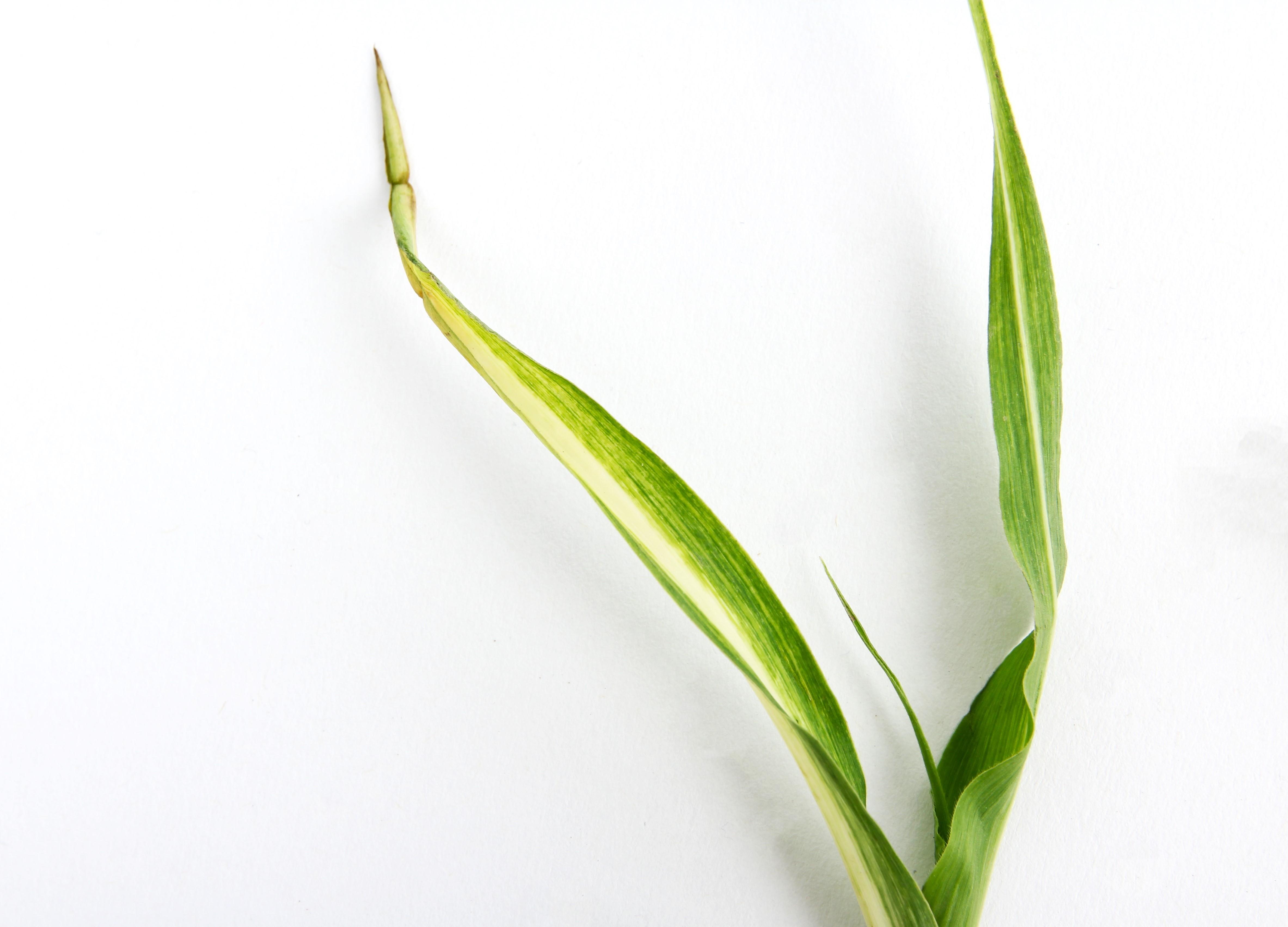Description: Les feuilles basales et médianes de plants de maïs sucré tolérant (variété tolérante) au glyphosate présentent une zone de jaunissement à blanchiment internervaire, le long de la nervure centrale. Un étranglement ou une déformation (enroulement) à l’apex, en lien avec les effets du glyphosate et aussi quelques brûlures à l’apex et à la marge, sont présents. La présence de ces bandes (« banding pattern ») sur le limbe est caractéristique d’une phytotoxicité par le glyphosate. Au champ, tous les plants montrent ces anomalies de coloration et sont par ailleurs faiblement développés. Les symptômes sont apparus graduellement sur les plants de maïs, traités au glyphosate (ROUNDUP WEATHER MAX) ainsi qu’avec l’ACURON FLEXI, en prélevée lors de conditions froides et humides.