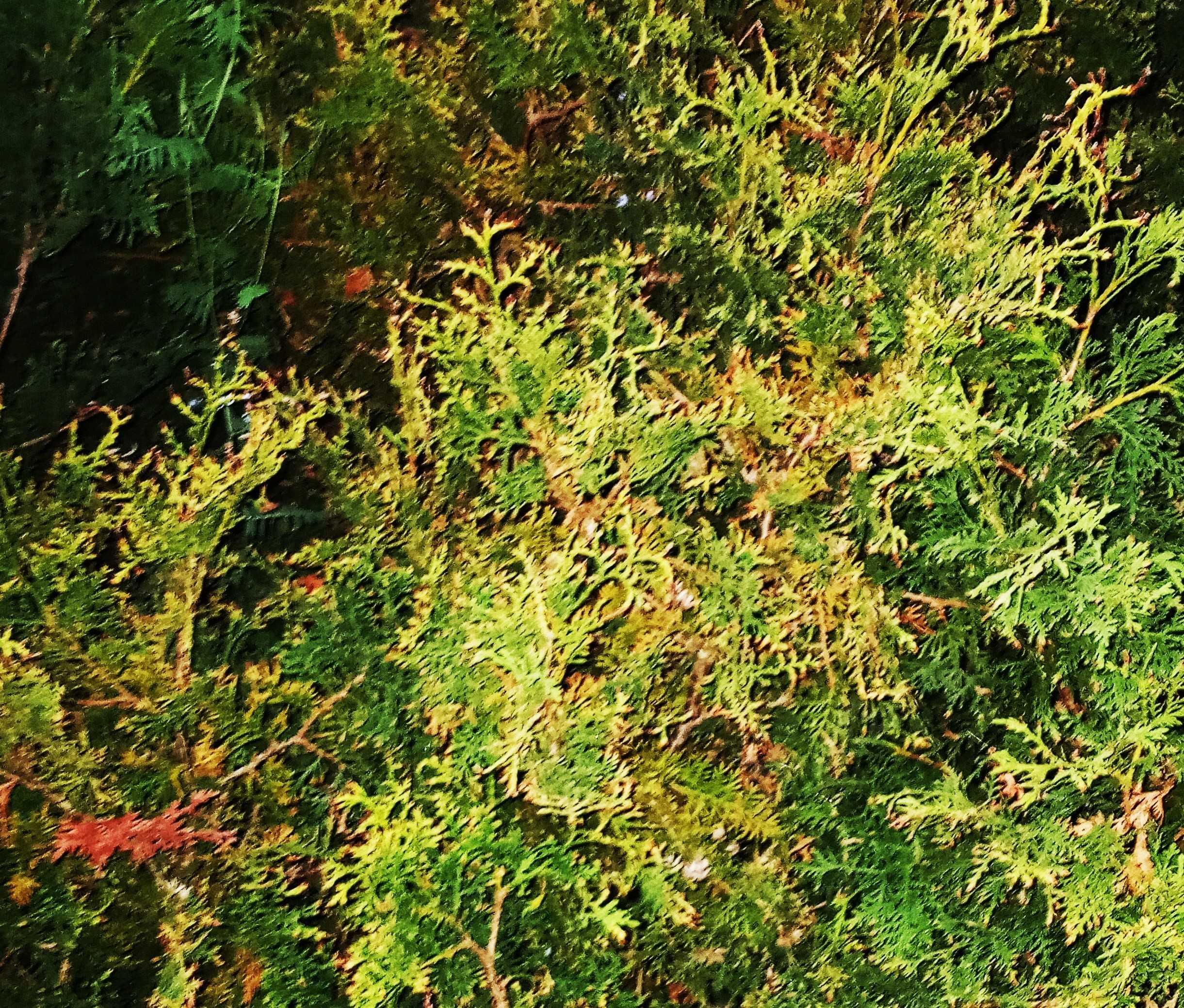 Description: Un thuya (Thuya occidentalis) dans une haie présente des jaunissements et brûlures sur ses feuilles terminales et sur ses fruits ainsi que de l'épinastie (courbure) des tiges et des feuilles terminales. Un dessèchement assez sévère est observé: les tissus déformés et desséchés s'effritent et tombent facilement (défoliation). Ces symptômes sont apparus graduellement et sont généralisés sur toute la haie. Une application de dicamba, un herbicide phytohormonal, a été effectuée sur la pelouse à proximité de la haie, dans des conditions de chaleur et de sécheresse importante. L'hypothèse est qu'il y aurait eu dérive de l'herbicide sur la haie. Une analyse chimique a confirmé la présence de dicamba, à une concentration élevée dans les tissus des arbres, ainsi que de la perméthrine, un insecticide (groupe 3A), à une faible concentration, cinq semaines après l'application sur la pelouse. Les symptômes de malformation sont typiques de ceux retrouvés avec les herbicides phytohormonaux, tel le dicamba. Les conditions de déficit hydrique (sécheresse, chaleur, érosion éolienne, etc.) ont probablement accéléré la pénétration et le transport des produits à l’intérieur des arbres. Dans une moindre mesure, la perméthrine peut amener un assèchement temporaire des tissus, aussi exacerbé par les conditions environnementales.