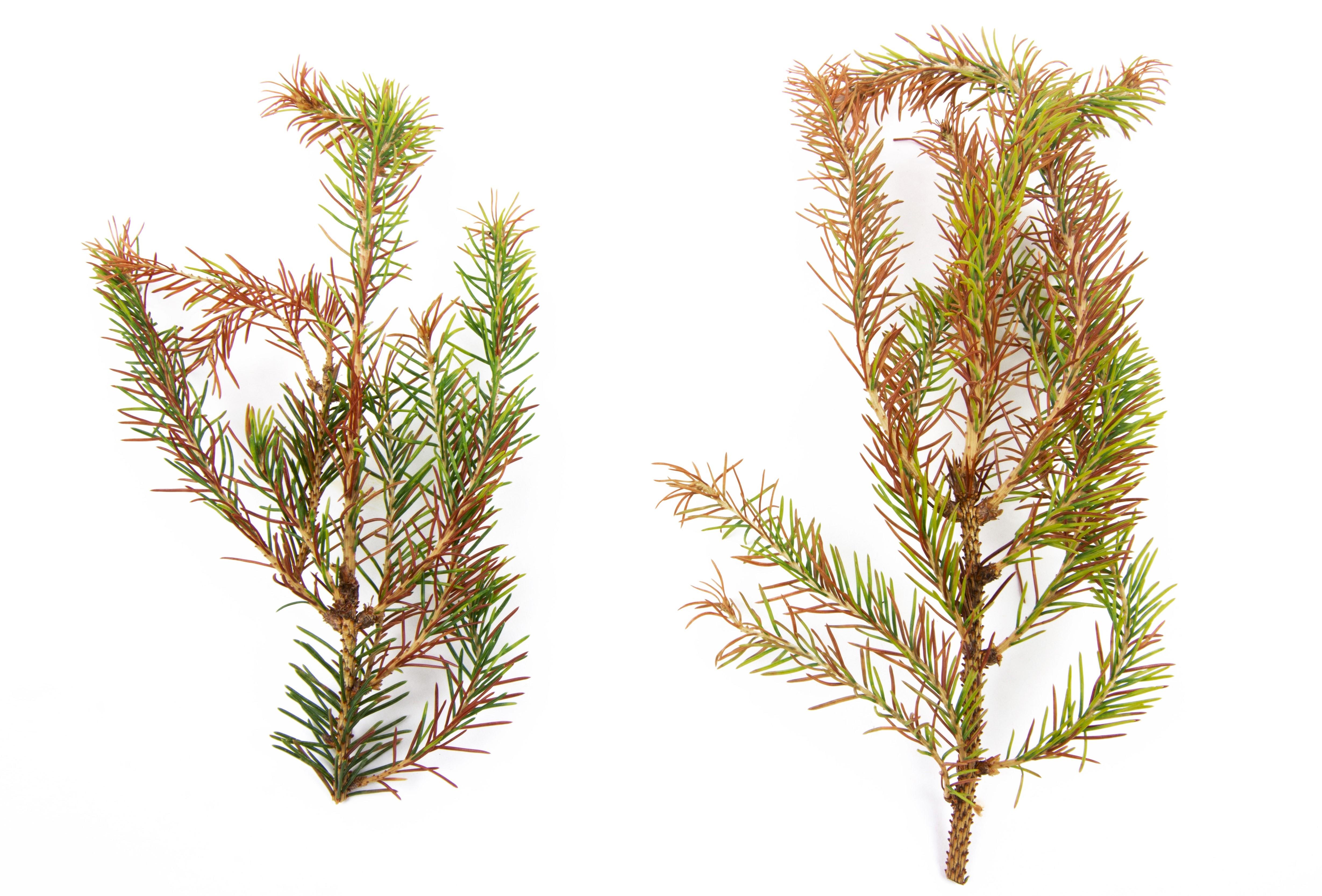 Légende: Tiges et aiguilles d’épinette jaunies ou brulées et déformées