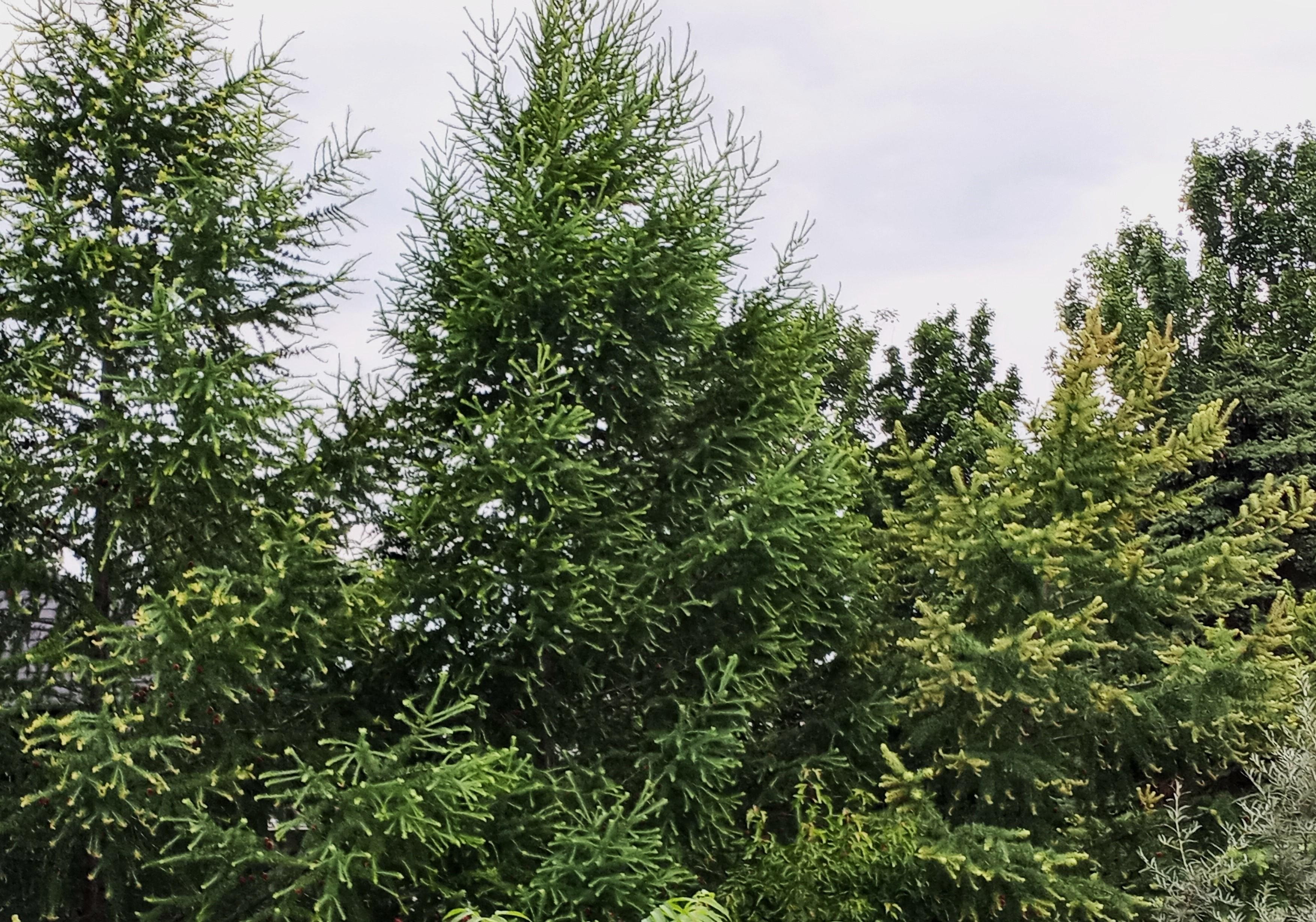 Description: Les feuilles (aiguilles) de mélèzes laricins présentent de sévères jaunissements (brûlures beige-brunes) et les tiges terminales (rameaux) des malformations (épinastie, torsion). Ces symptômes sont apparus graduellement et sont généralisés sur tous les arbres à proximité d’une pelouse. Une application de dicamba, un herbicide phytohormonal, a été effectuée sur cette pelouse et au pied des arbres (par erreur), dans des conditions de chaleur et de sécheresse importantes. Une analyse chimique a confirmé la présence de dicamba, à une concentration élevée, cinq semaines après son application. Après ce délai, les feuilles (aiguilles) s’effritent et la majorité tombent (non visible ici). Les symptômes de malformation sont typiques de ceux retrouvés avec les herbicides phytohormonaux, tel le dicamba. Les conditions de déficit hydrique (sécheresse, chaleur, érosion éolienne, etc.) au moment de l'application ont accéléré la pénétration et le transport du produit à l’intérieur des arbres, ce qui a amené une malformation des tissus et éventuellement la lyse des cellules méristématiques (dessèchements, jaunissements, brûlures et défoliation).