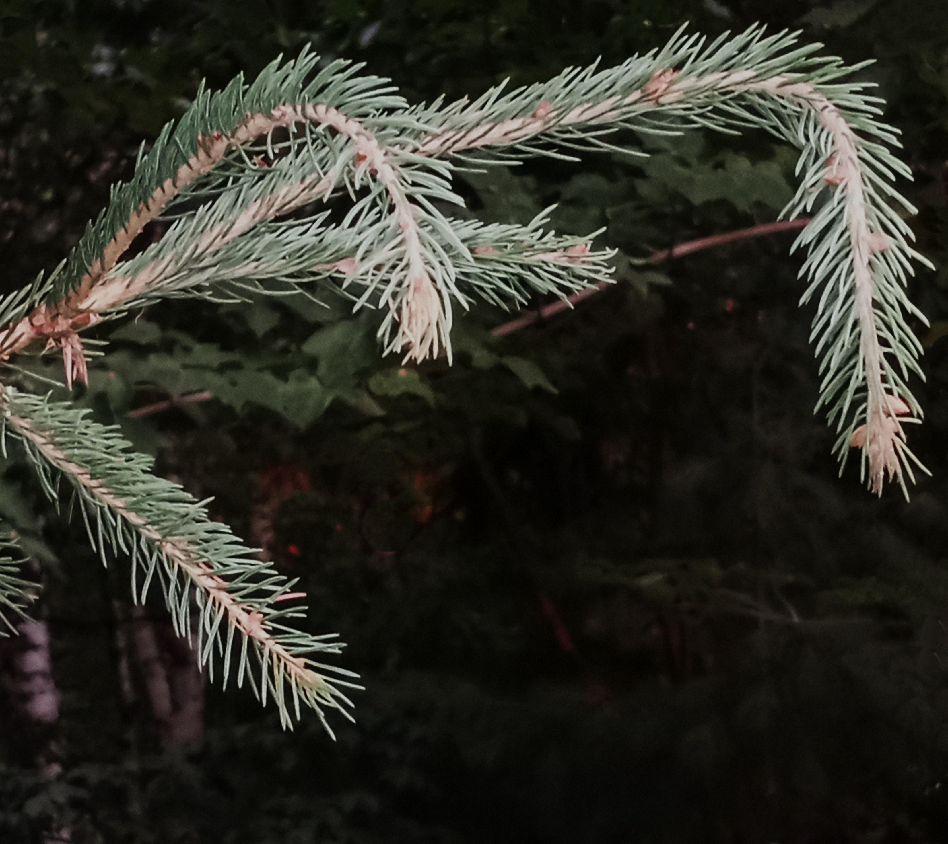 Description: Les rameaux terminaux d'une épinette du Colorado (Picea pungens) sont courbés vers le bas (épinastie). Ce symptôme est apparu graduellement et est généralisé sur l'arbre. Une application de dicamba, un herbicide phytohormonal, a été effectuée sur la pelouse à proximité de l'arbre, dans des conditions de chaleur et de sécheresse importantes. Un dosage chimique a confirmé la présence de dicamba, à une concentration élevée dans les tissus de l'arbre, ainsi que de la perméthrine, un insecticide (groupe 3A), à une faible concentration, cinq semaines après l'application sur la pelouse. Les symptômes de malformation sont typiques de ceux retrouvés avec les herbicides phytohormonaux, tel le dicamba. Les conditions de déficit hydrique (sécheresse, chaleur, érosion éolienne, etc.) au moment de l'application ont accéléré la pénétration et le transport des produits à l’intérieur des arbres, ce qui a amené une malformation des tissus et éventuellement la lyse des cellules méristématiques (dessèchements, brûlures et défoliation), non visible ici. Dans une moindre mesure, la perméthrine peut amener un assèchement temporaire des tissus, aussi exacerbé par les conditions environnementales.