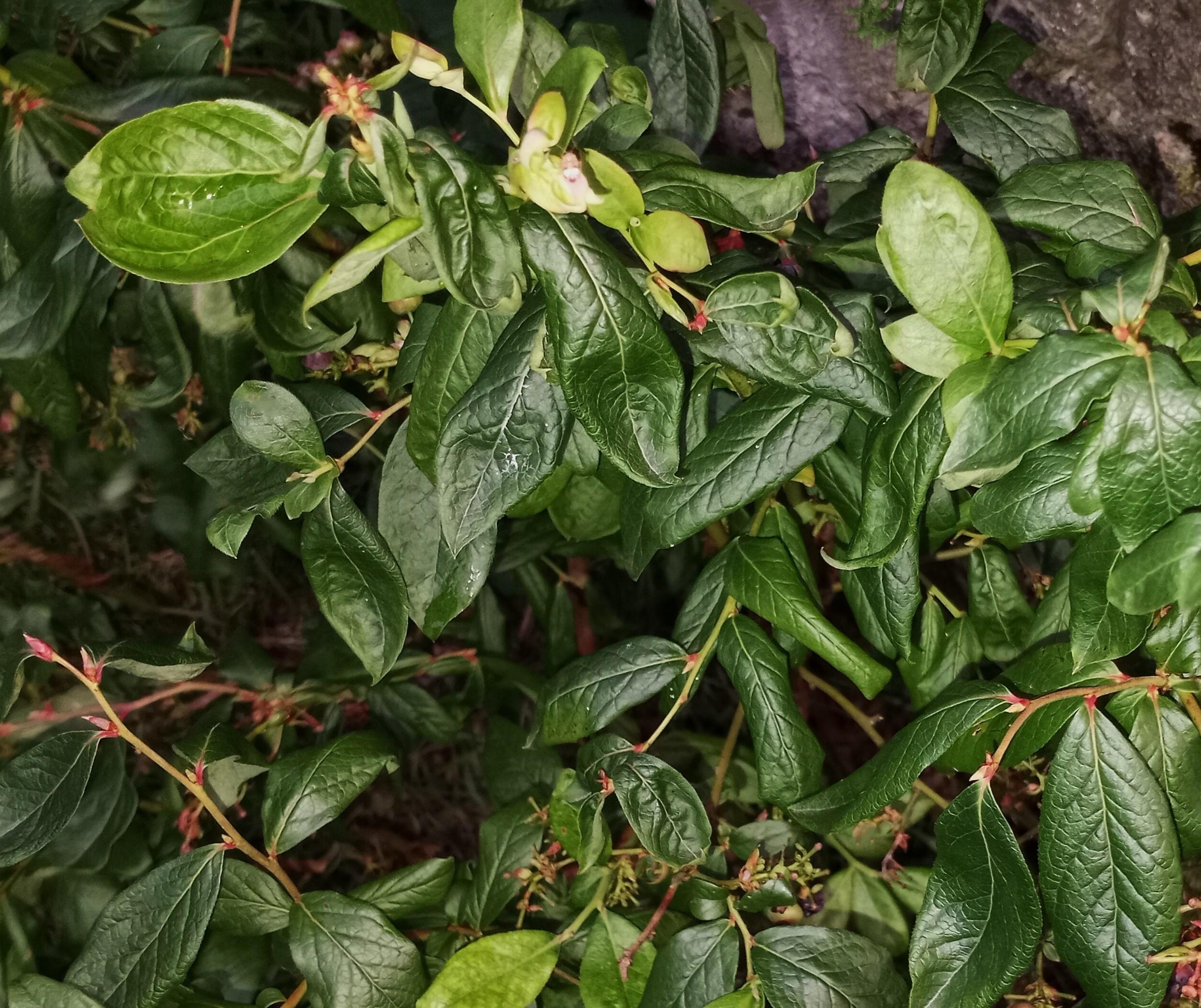 Description: Les feuilles d’un plant de bleuet en corymbe (Vaccinium corymbosum) montrent des malformations (déformation vers le bas à partir de la nervure centrale, gaufrure des tissus, torsion) et sont flétries. Les tiges sont aussi courbées vers le bas. Ces symptômes sont apparus graduellement sur l’arbuste, situé à proximité d’une pelouse. Une application de dicamba, un herbicide phytohormonal, a été effectuée sur la pelouse, dans des conditions de chaleur et sécheresse importantes. Une analyse chimique a confirmé la présence de dicamba, à une concentration élevée, cinq semaines après son application. Les symptômes de malformation sont typiques de ceux retrouvés avec les herbicides phytohormonaux, tel le dicamba. Les conditions de déficit hydrique (sécheresse, chaleur, érosion éolienne, etc.) au moment de l'application ont accéléré la pénétration et le transport du produit à l’intérieur de la plante, ce qui a amené une malformation des tissus.