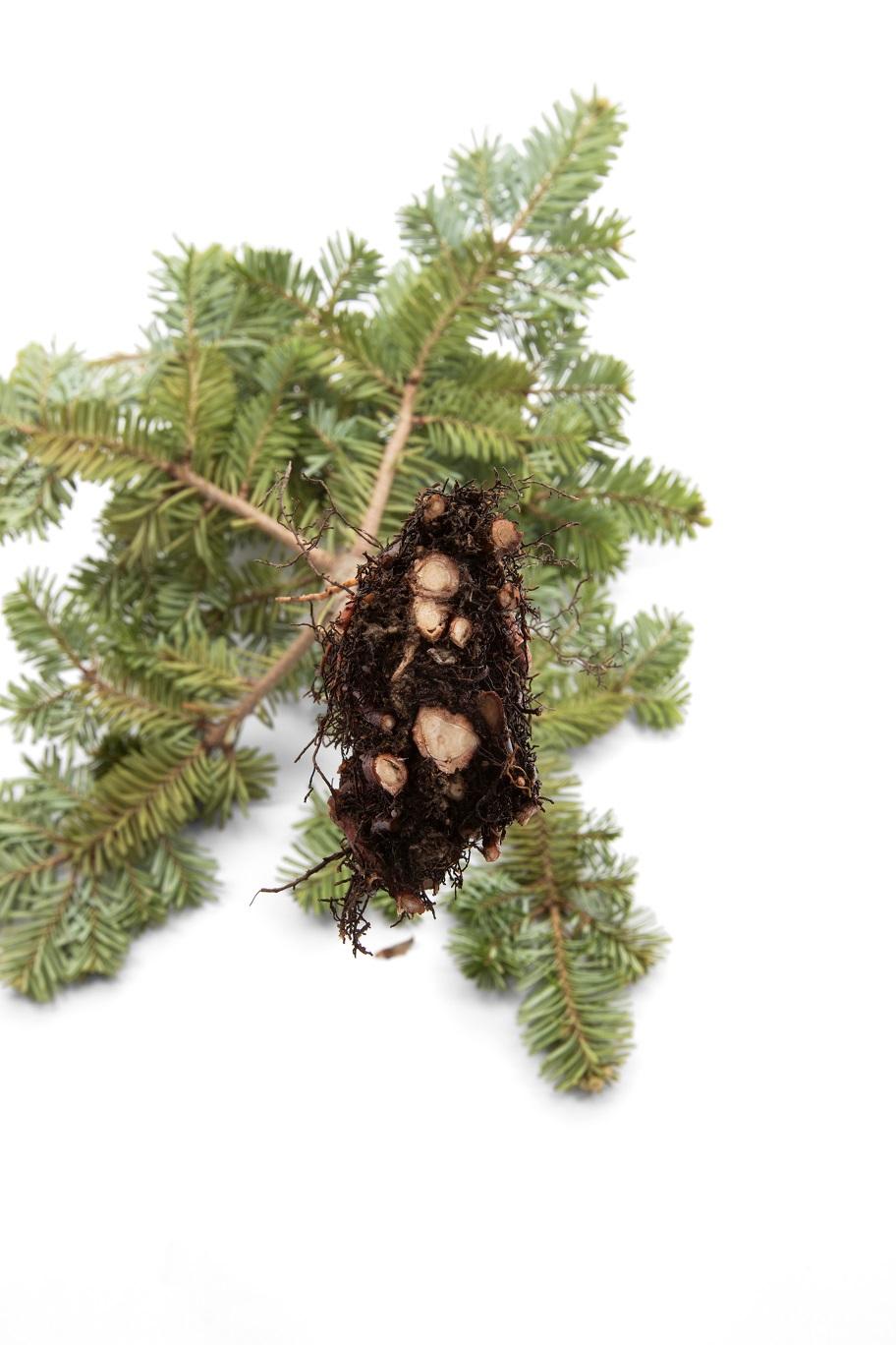 Description: Jeune plant de sapin Fraser affecté par Phytophthora abietivora, on peut observer un noircissement du système racinaire généralisé. Lorsqu’on coupe au niveau des racines de manière transversale, on peut voir un brunissement important au niveau de l’écorce.