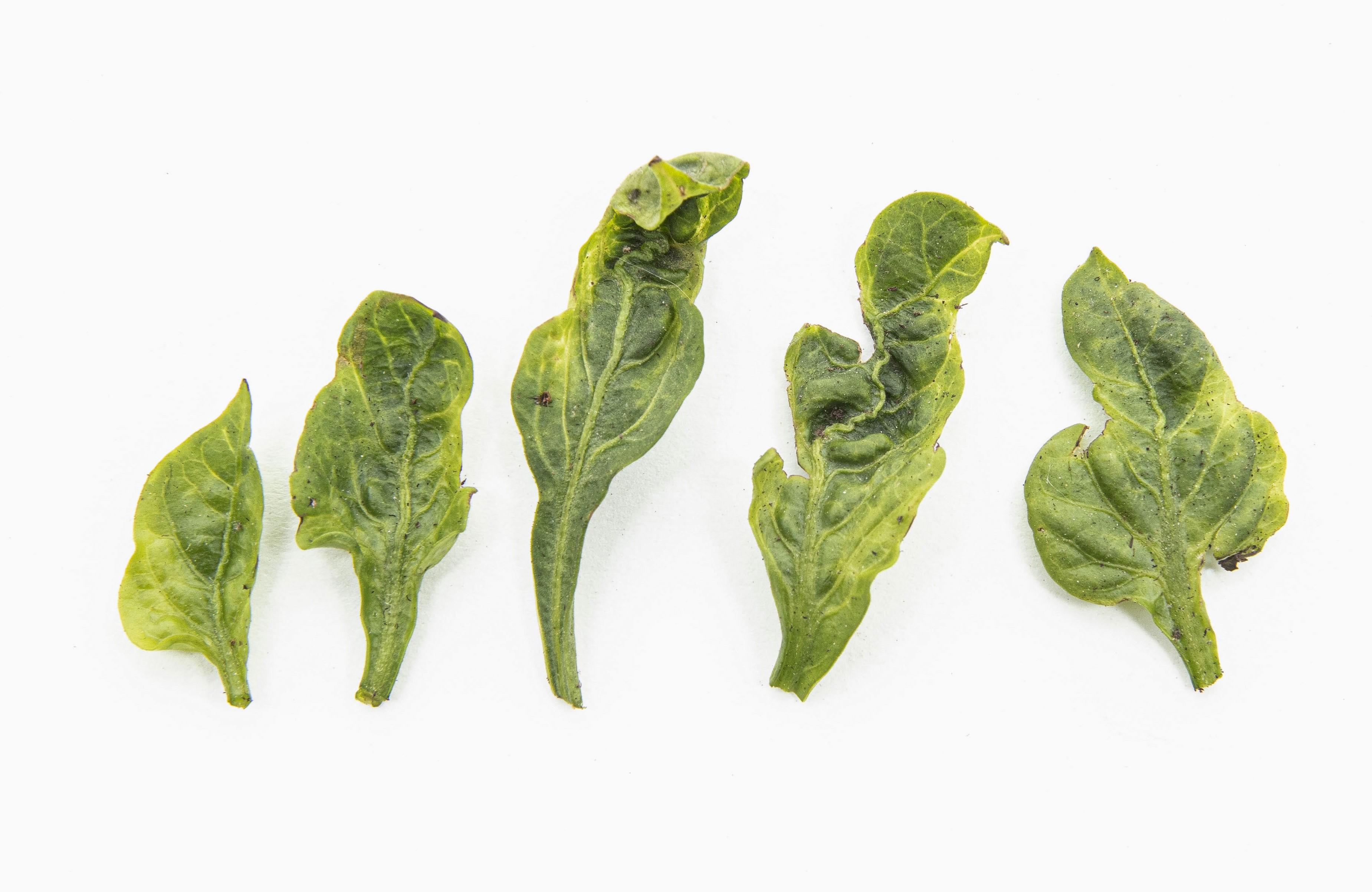 Description: Les feuilles terminales d’un plant de poivron (piment doux) sont déformées, le limbe est gaufré et texturé. Un jaunissement, léger et diffus, internervaire, débute à la base du limbe et progresse vers l’apex. Par ailleurs, aucun des virus testés n'a été détecté dans les feuilles de cet échantillon. Le dosage chimique réalisé a révélé une concentration assez élevée de S-métolachlore dans les tissus du poivron. L’herbicide DUAL II MAGNUM (S-métolachlore) a été appliqué sur la culture : même s’il y est homologué, il peut provoquer des dommages qui débutent par un jaunissement internervaire, suivi d’un brunissement et une nécrose des tissus. Il peut également causer des malformations sur les parties terminales. Dans ce cas-ci, le printemps frais et humide peut avoir contribué à ralentir la métabolisation de l’herbicide dans la plante, accentuant ainsi les symptômes de phytotoxicité. Le flonicamide et le terbacil ont aussi été détectés à une concentration normale mais ne sont pas associés aux symptômes observés.