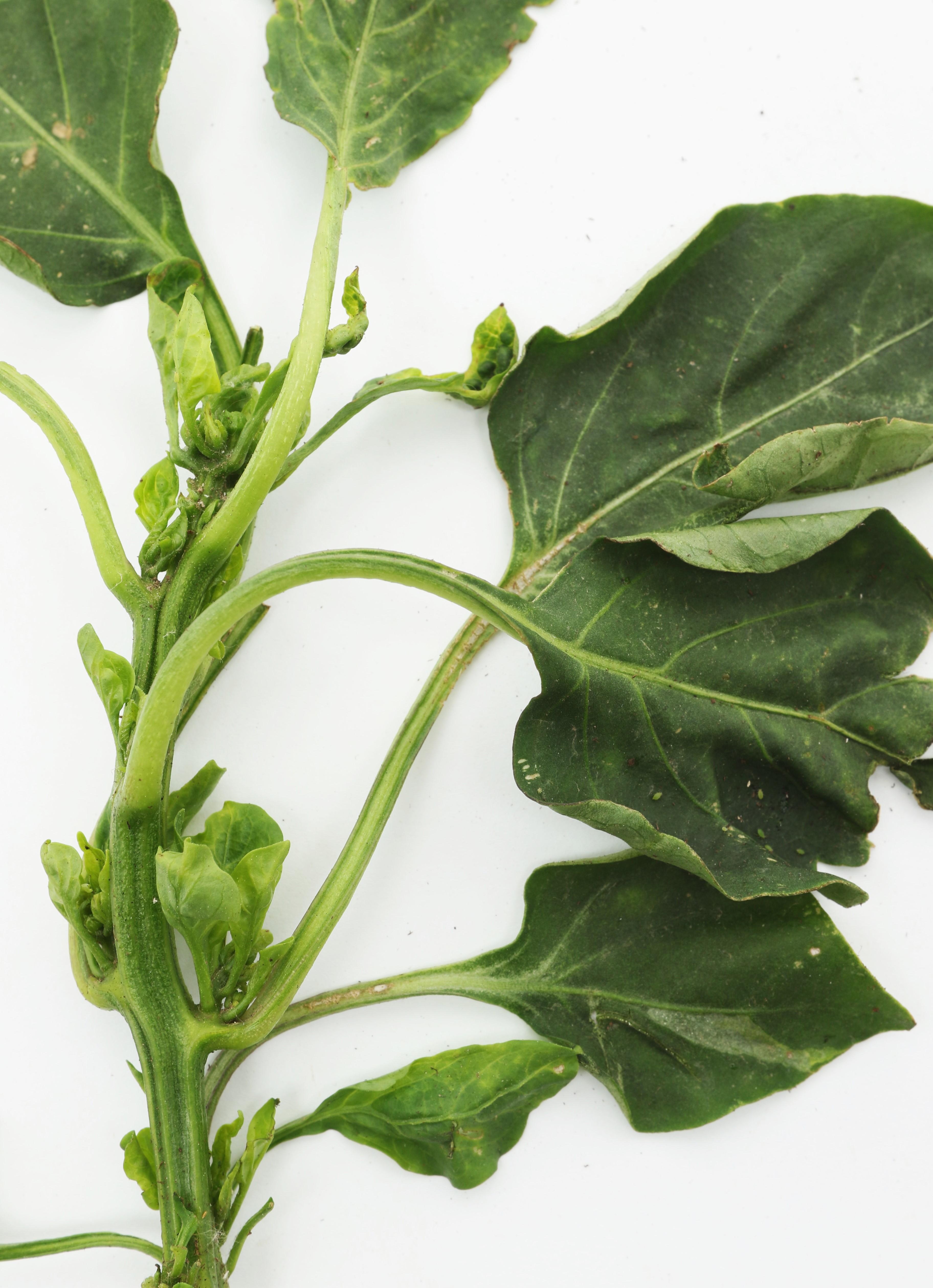 Description: Les feuilles terminales d’un plant de poivron (piment doux) sont déformées, le limbe est gaufré et texturé. Un jaunissement, léger et diffus, internervaire, débute à la base du limbe et progresse vers l’apex. Par ailleurs, aucun des virus testés n'a été détecté dans les feuilles de cet échantillon. Le dosage chimique réalisé a révélé une concentration assez élevée de S-métolachlore dans les tissus du poivron. L’herbicide DUAL II MAGNUM (S-métolachlore) a été appliqué sur la culture : même s’il y est homologué, il peut provoquer des dommages qui débutent par un jaunissement internervaire, suivi d’un brunissement et une nécrose des tissus. Il peut également causer des malformations sur les parties terminales. Dans ce cas-ci, le printemps frais et humide peut avoir contribué à ralentir la métabolisation de l’herbicide dans la plante, accentuant ainsi les symptômes de phytotoxicité. Le flonicamide et le terbacil ont aussi été détectés à une concentration normale mais ne sont pas associés aux symptômes observés.