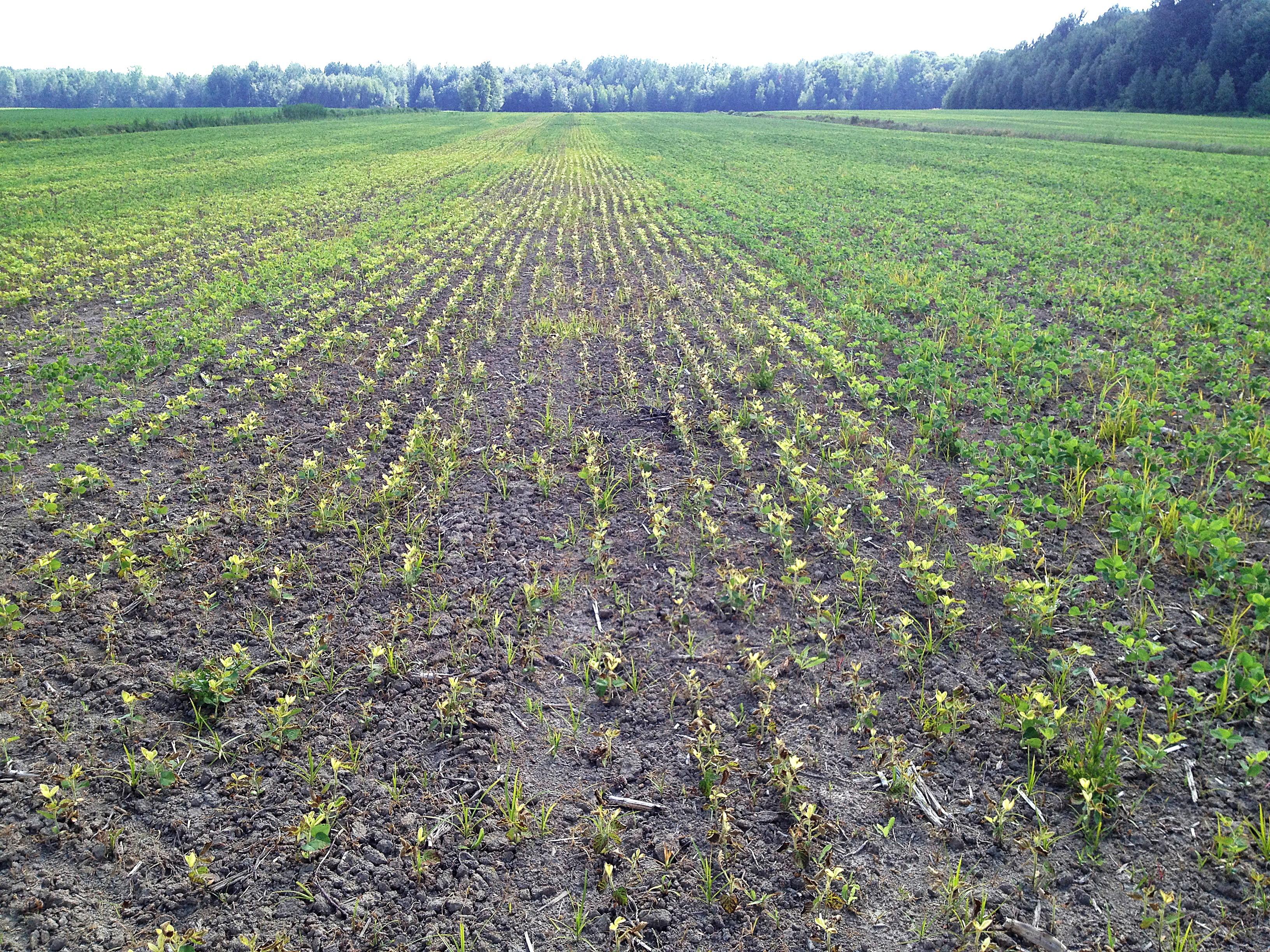 Légende: Champ de soya clairsemé avec plants jaunis et brûlés