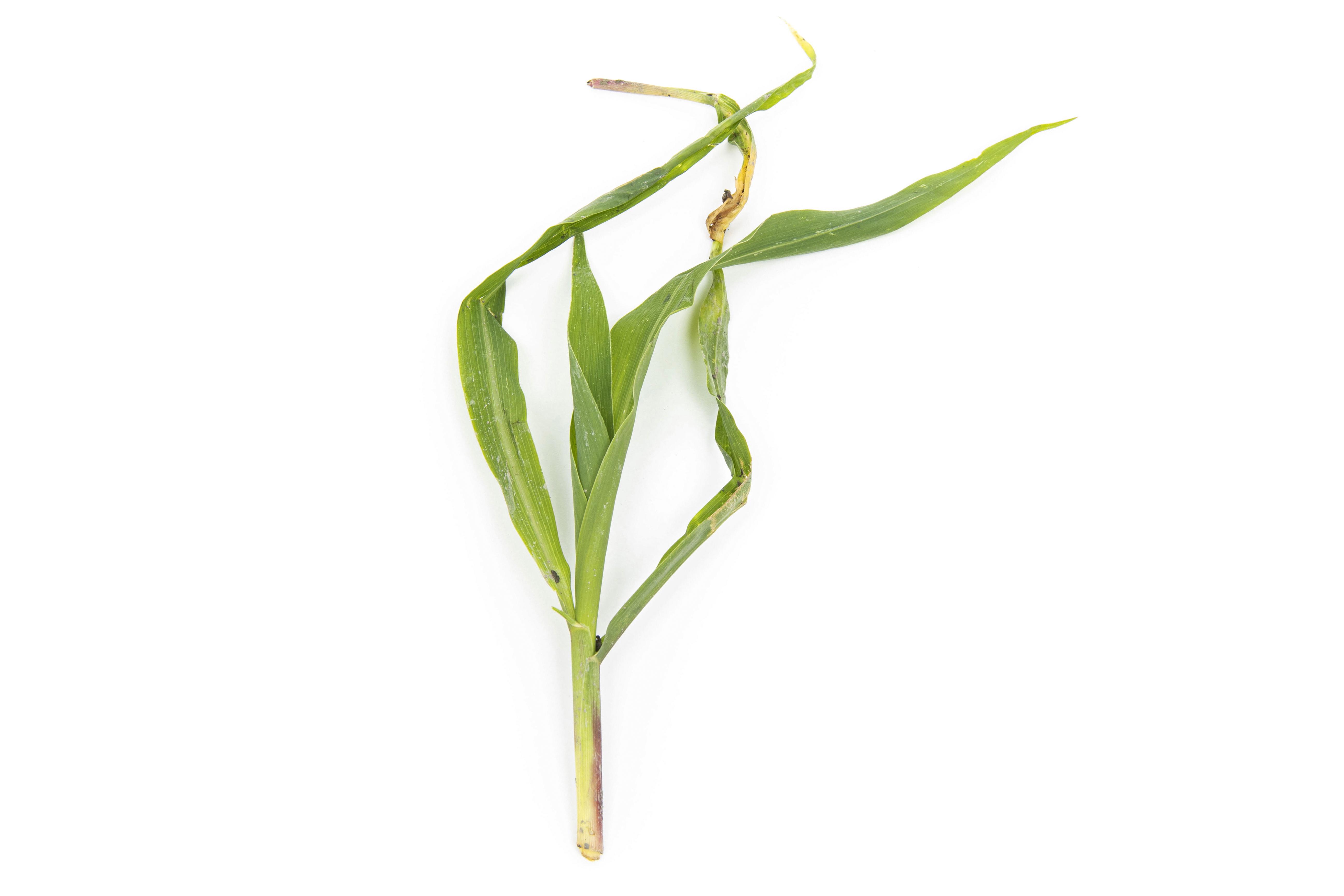 Description: Les feuilles basales et médianes de maïs-grain (Zea mays) sont déformées (étroitement enroulées sur elles-mêmes) et les tissus sont gaufrés. Un jaunissement à brunissement est aussi présent sur une partie du limbe de certaines feuilles. Une application de l’herbicide INTEGRITY (diméthénamide-P (groupe 15); saflufénacil (groupe 14)) a été faite en pré-semis dans le champ, suivie de pluies abondantes. Bien que l’herbicide soit homologué dans la culture du maïs, des dommages tels que ceux observés peuvent survenir lorsque la semence est mise en contact avec l'herbicide, en particulier lors de fortes pluies et/ou qu'un délai d’au moins 7 jours entre l’application et le semis n’a pas été respecté, ce qui est le cas ici. Un dosage chimique réalisé sur les tissus végétaux n'a pas décelé de trace diméthénamide-P, probablement déjà métabolisé par la plante, mais de l’azoxystrobine (fongicide, groupe 11), du chlorantraniliprole et du cyantraniliprole (insecticides néonicotinoïdes, groupe 28) y ont été décelés à très faible concentration et ne sont pas en lien avec les symptômes observés. Les symptômes associés au diméthénamide-P sont habituellement passagers et la culture reprend une croissance et un développement normaux.