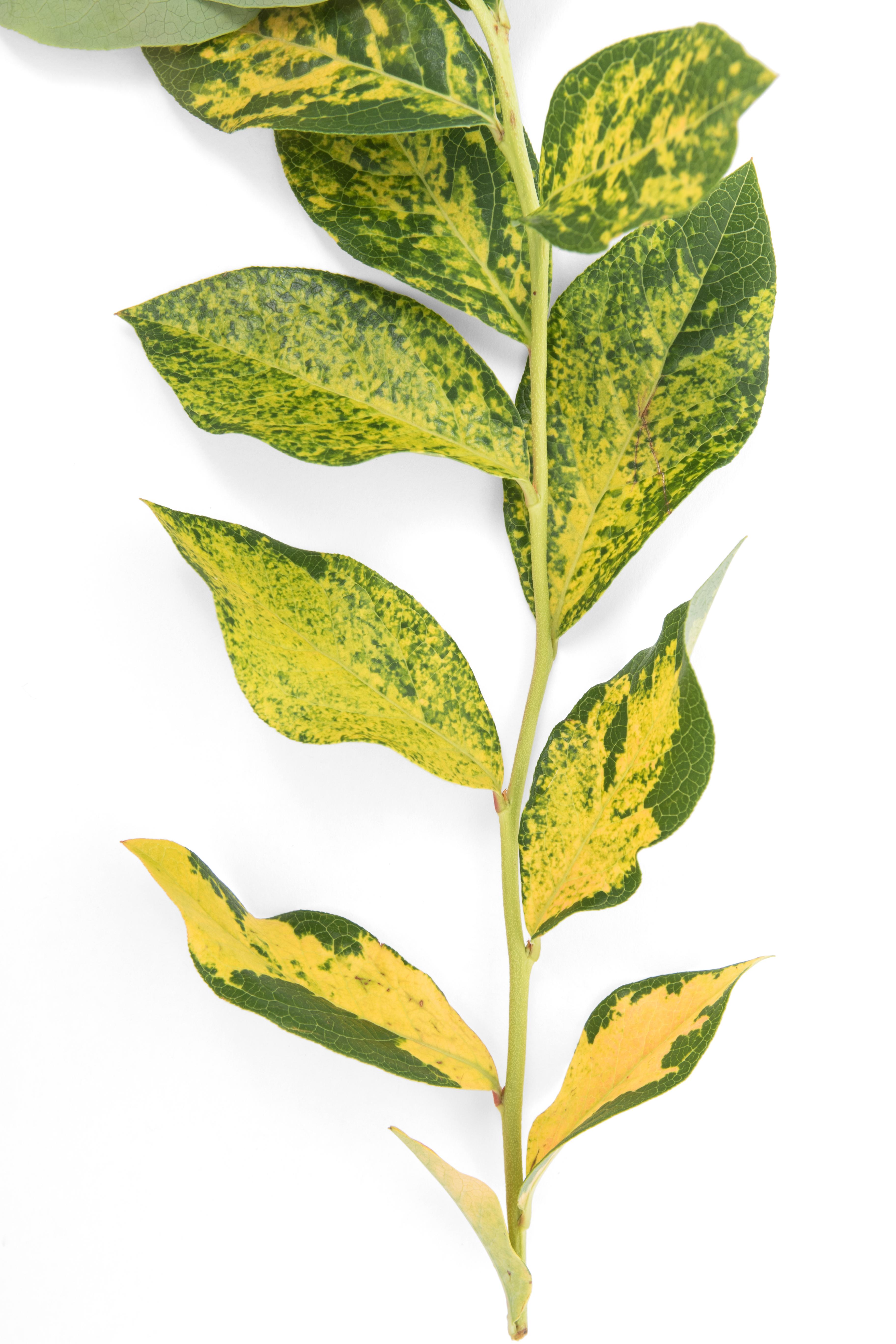 Description: Bleuetier (cv. Patriot) co-infecté par le virus de la mosaïque du bleuet (BlMaV), le virus latent du bleuet (BBLV) et le virus A du bleuet (BVA). L'échantillon a été prélevé au début du mois de juillet dans une parcelle en production conventionnelle. Les feuilles présentent d'importantes mosaïques jaune et vertes.