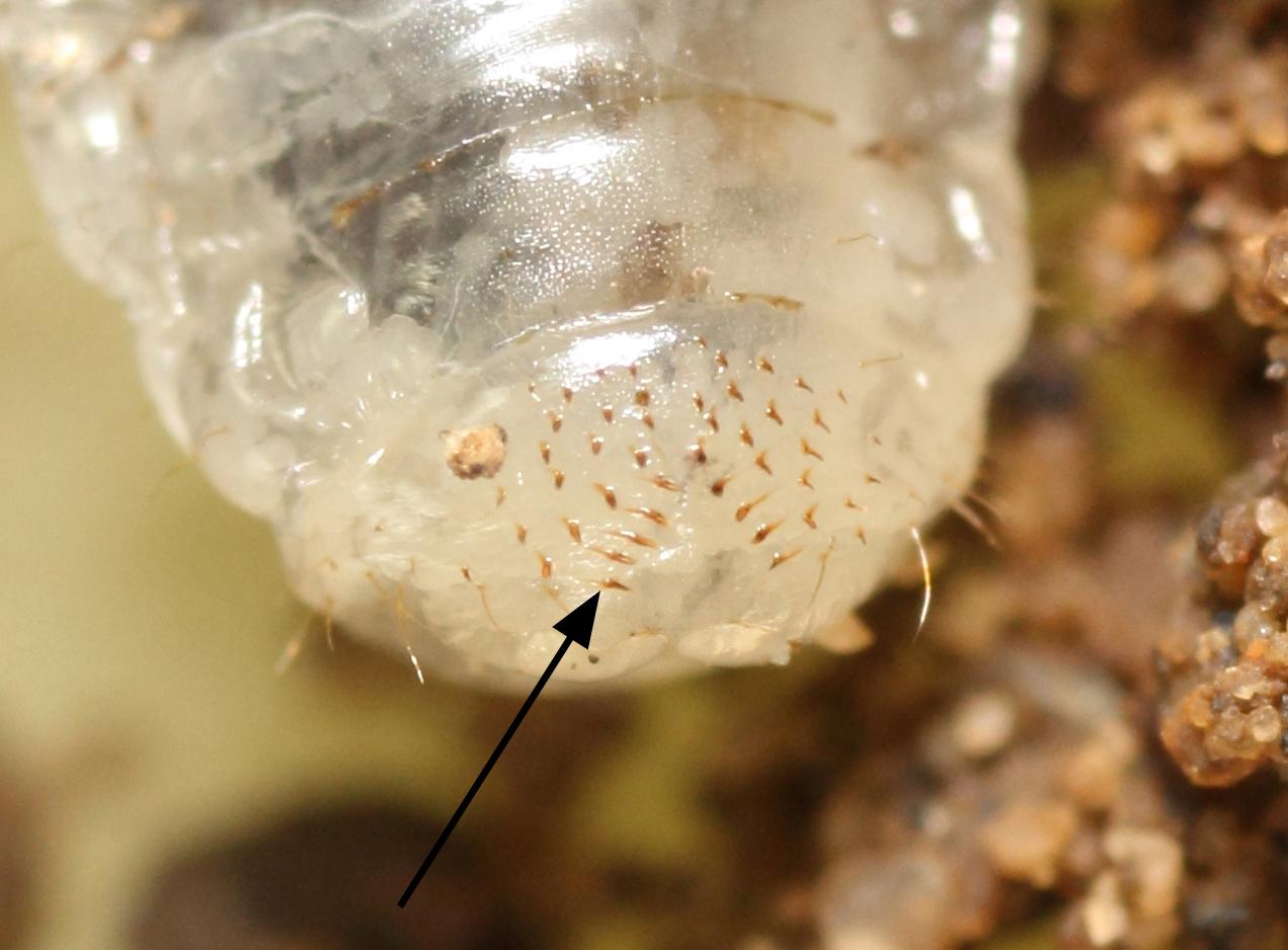 Légende: Chez les larves du scarabée japonais, les rangées d'épines présentes sur la section ventrale du dernier segment abdominal (raster) sont disposées en "V". Cette caractéristique permet de différ