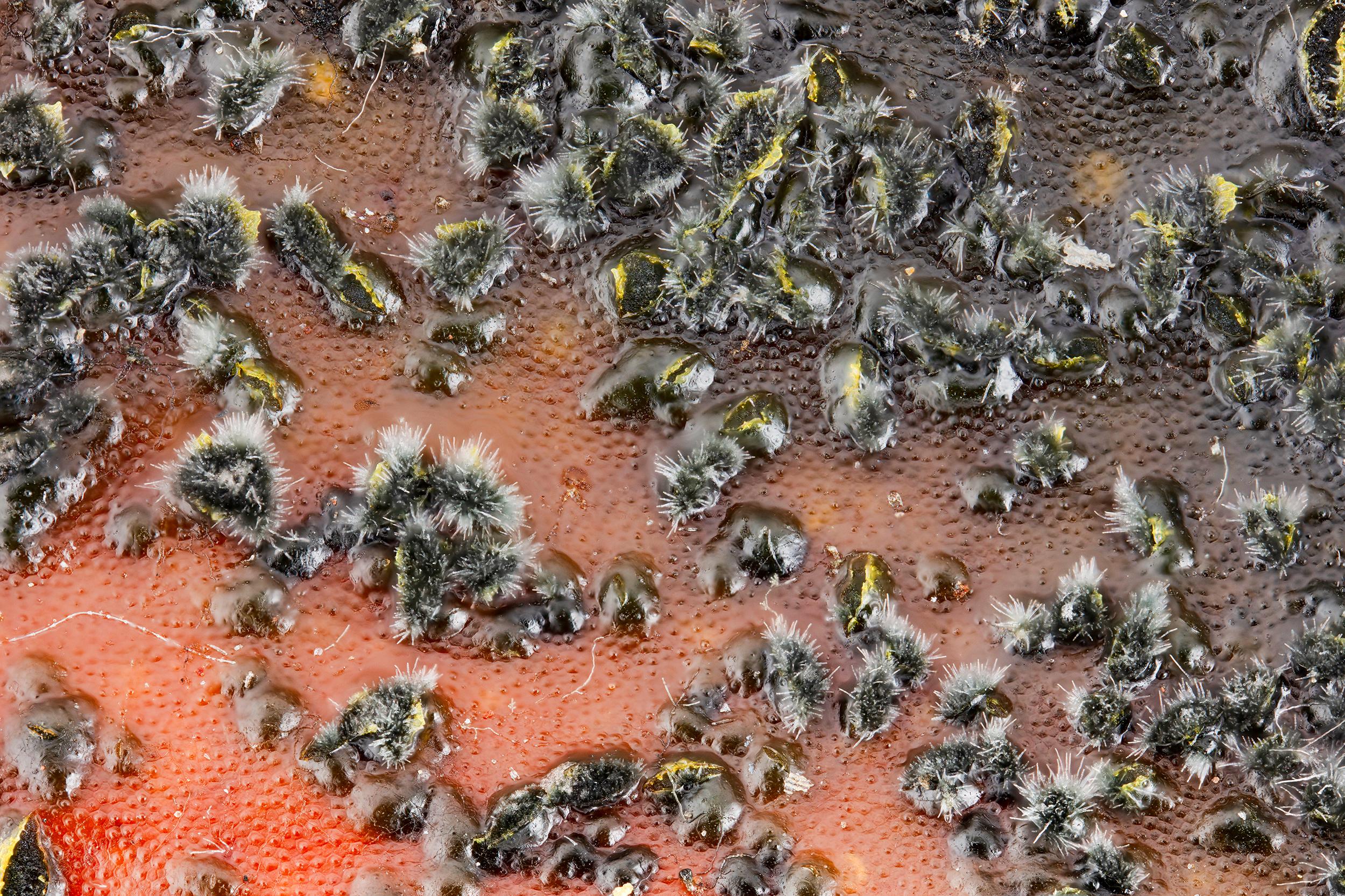 : Acervules maturent de Colletotrichum du groupe acutatum sur un fruit de tomate. Focus stacking.