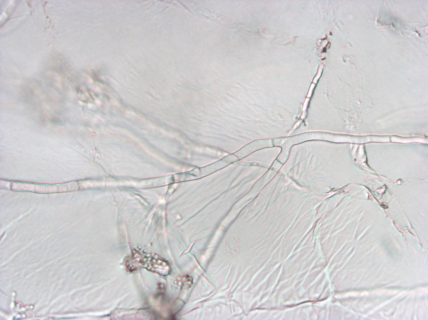 : Croissance mycélienne de Sclerotium cepivorum sur milieu SNA. Hyphe septé montrant un embranchement dichotomique.