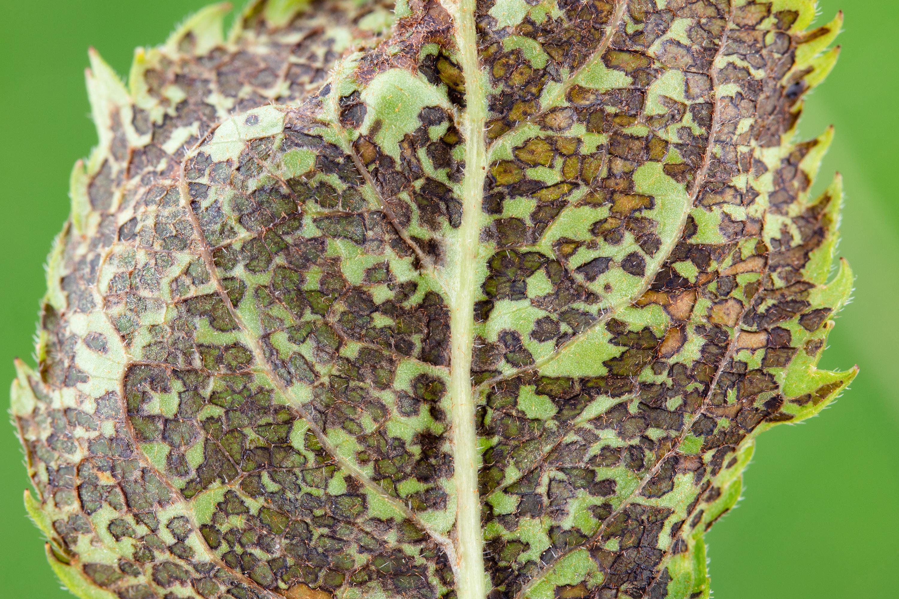 : Dommages de la punaise à quatre raies sur une feuille de sureau