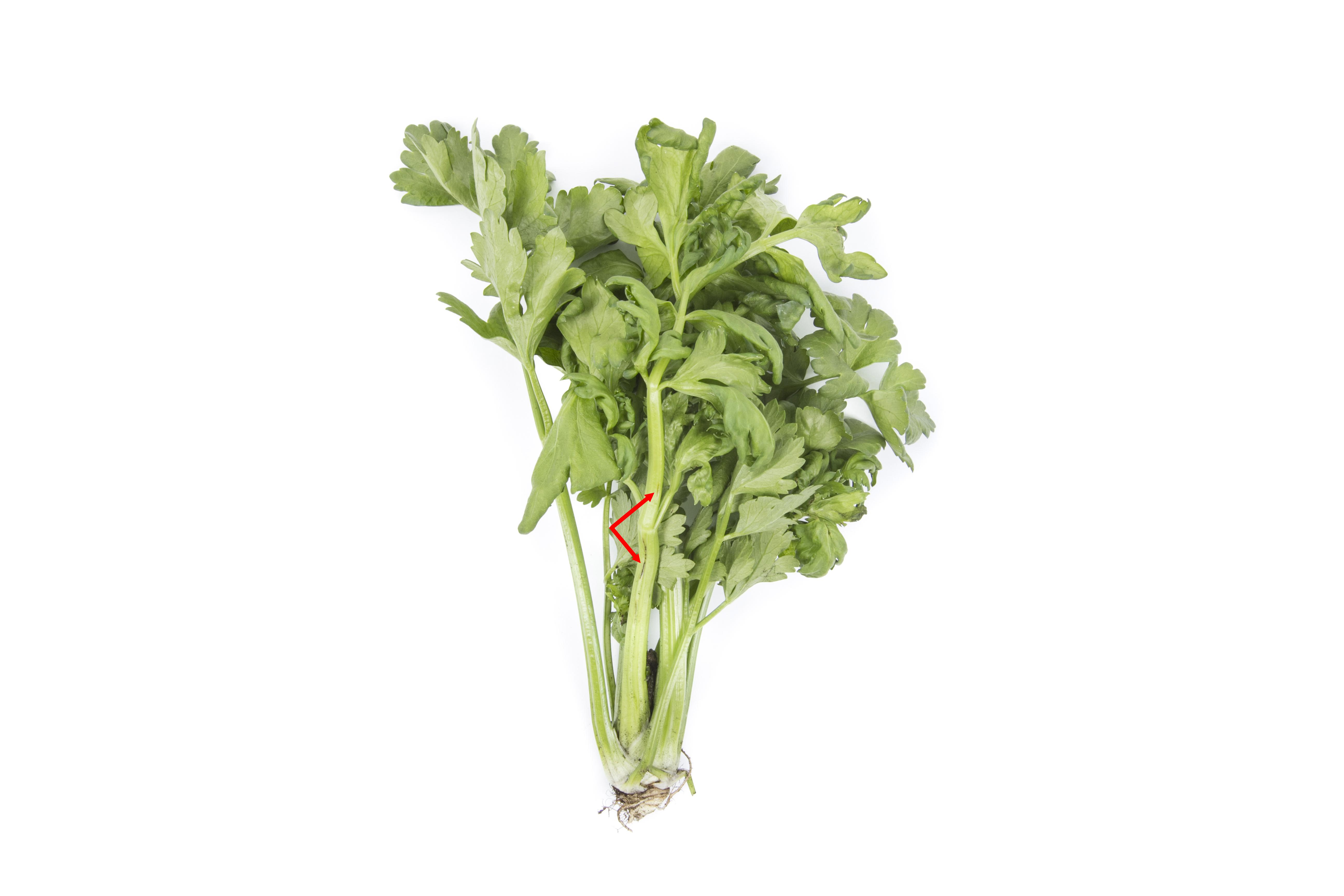 Description: Le pétiole d’un plant de céleri a des lésions brunes sur une côte (voir flèches). Le plant montre une déformation sévère et un enroulement des feuilles (peu visible ici). Les tests de laboratoire ont révélé la présence du champignon Colletotrichum sp., responsable de l’anthracnose chez le céleri. Il s’agit probablement de C. acutatum.