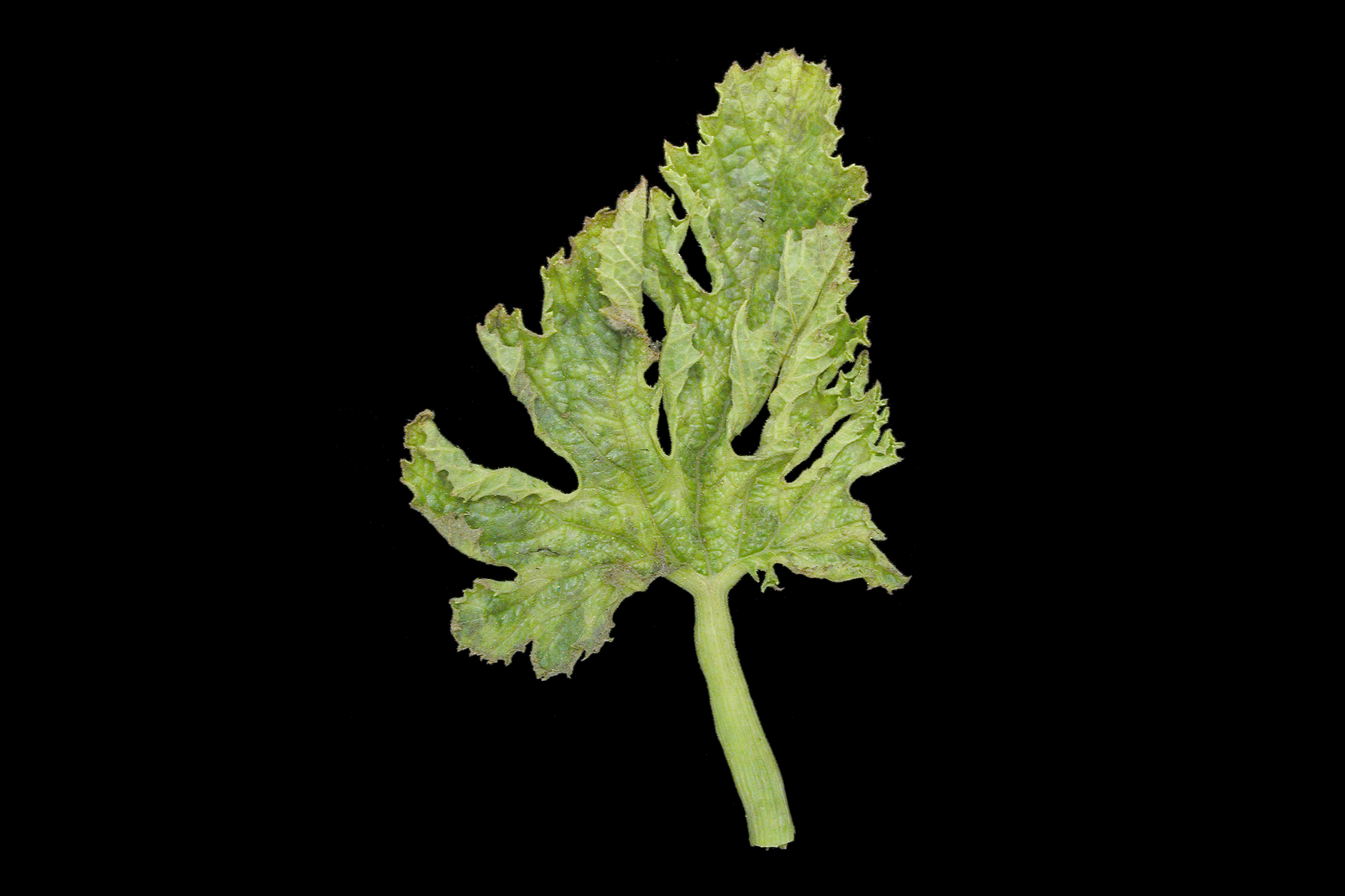 Description: Sur une feuille de zucchini, présence d’une mosaïque jaune et vert pâle répartie uniformément sur toute la surface du limbe. Les tests de laboratoire ont révélé la présence d’un complexe viral constitué du virus de la mosaïque du concombre (CMV) et d’un virus appartenant au groupe des Potyvirus. La conseillère agricole mentionne que les symptômes sont distribués de manière éparse au champ et que 5 % des plants sont touchés. Les symptômes sont apparus à la suite de températures élevées.