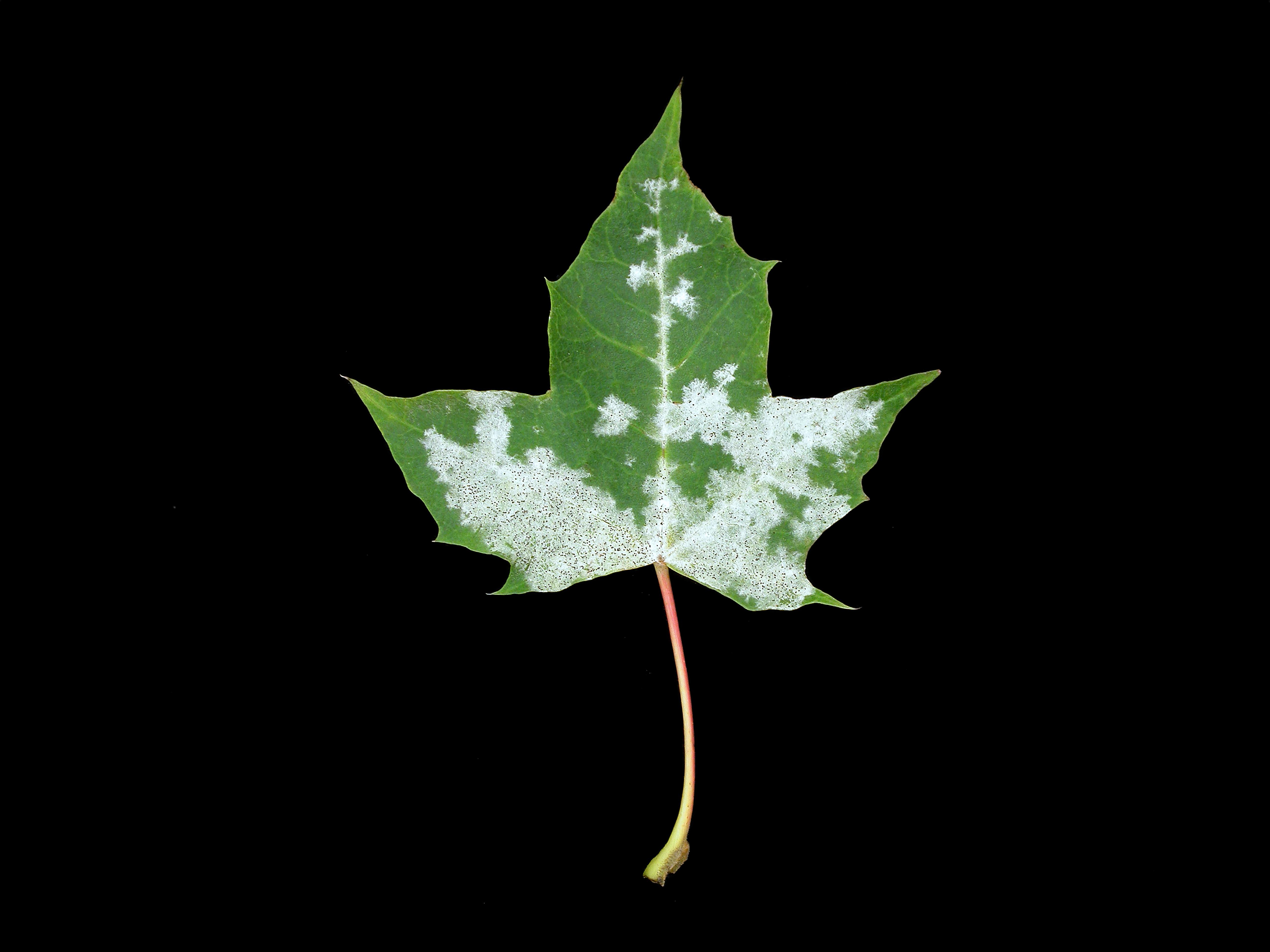Légende: Mycélium blanc et cléistothèces sur feuille d'érable