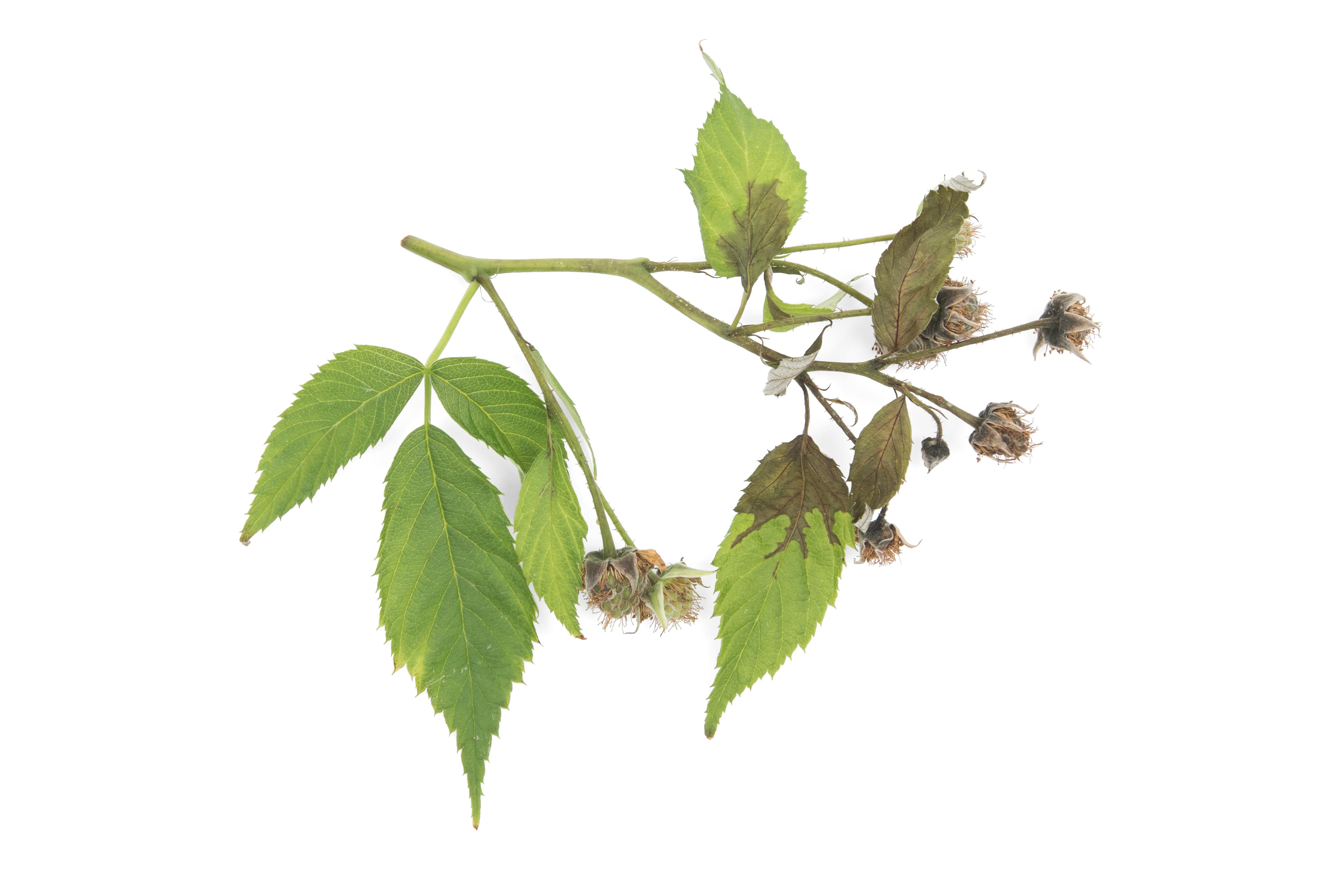 Description: Sur cette tige annuelle de framboisier, la plupart des fruits immatures sont complètement noircis et demeurent attachés au pédoncule. On observe également un noircissement à partir de la base du limbe de certaines feuilles. La coloration suit les nervures des feuilles et finit par noircir complètement le limbe. Les sépales et les pédicelles sont aussi noircis et un exsudat gommeux et collant en forme de gouttelettes apparaît sur les tissus affectés. Ces symptômes sont caractéristiques de la brûlure bactérienne, causée par Erwinia amylovora. Les tests en laboratoire ont d’ailleurs permis la détection de cette bactérie dans les tissus de l'échantillon.