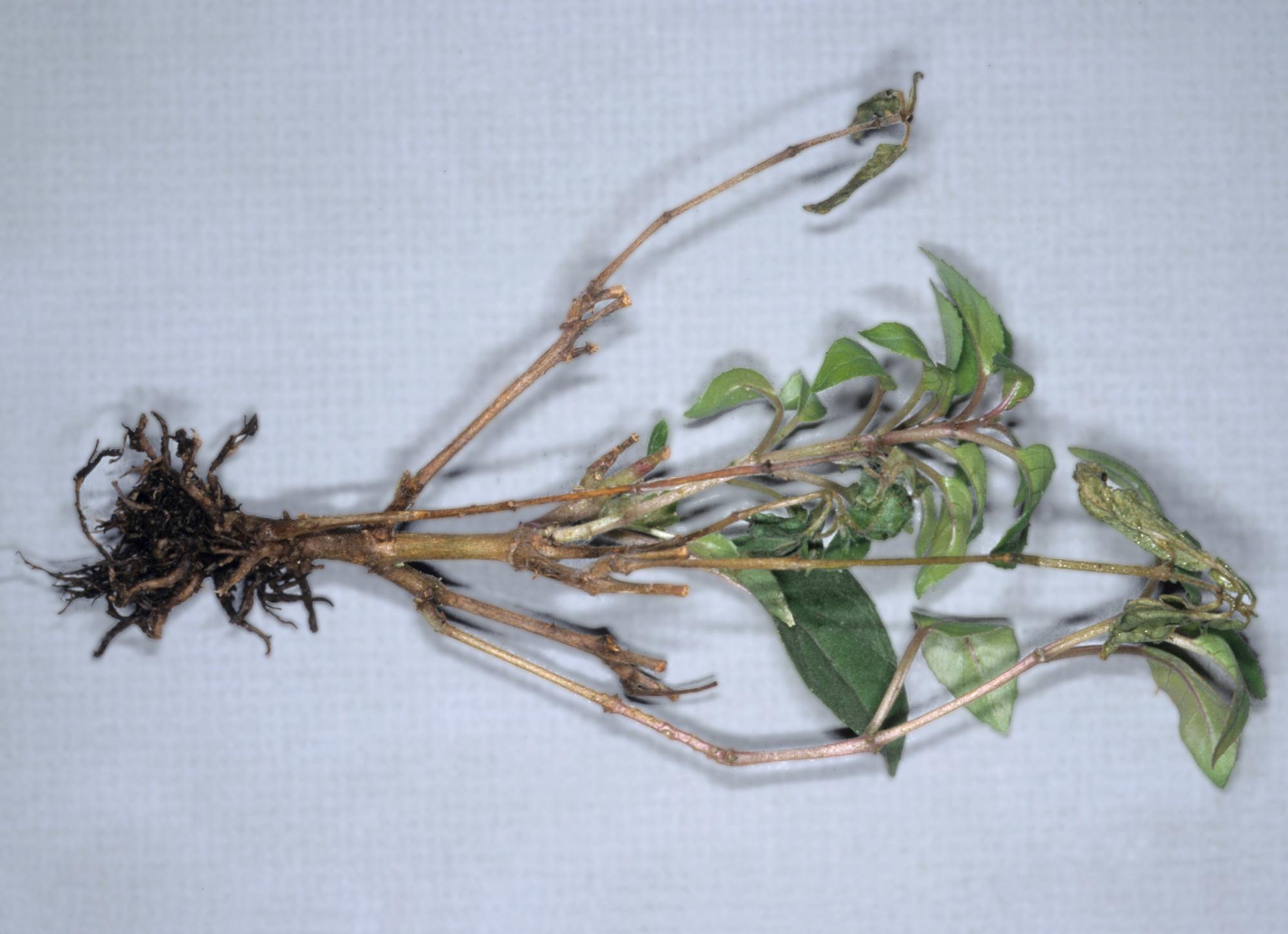 Description: Sur ce plant de fuchsia cultivé en serre, présence d’un système racinaire faiblement développé avec quelques racines noires. Certaines tiges sont peu feuillées tandis que d’autres sont sans symptôme. Les observations microscopiques ont révélé la présence du champignon Berkeleyomyces basicola (syn. Thielaviopsis basicola), responsable de la pourriture noire des racines.