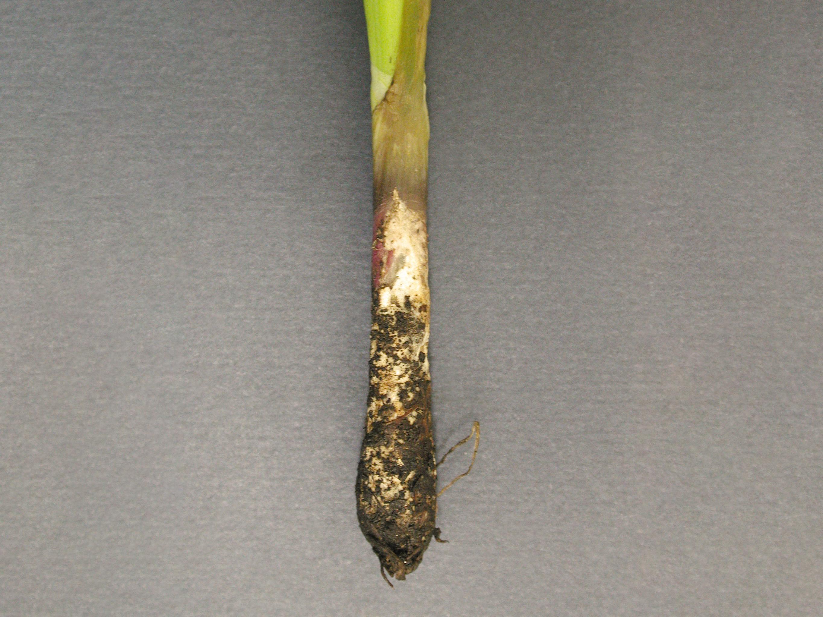 Description: La base d’un plant d’oignon sec (cv 'Red Zeppelin') provenant d’un champ présente une importante pourriture qui se caractérise par un ramollissement ainsi qu’une apparence humide et vitreuse des tissus. La pourriture affecte particulièrement le collet et le bulbe. Sur ces organes, il y a la présence d’un mycélium blanc, duveteux et de petits sclérotes noirs et sphériques. Les tissus internes du bulbe sont affectés (non visible ici). Les racines sont peu développées et pourries. Les feuilles basales sont flétries et pourries. Les observations microscopiques ont révélé la présence de mycélium et de sclérotes du champignon Sclerotium cepivorum, responsable de la pourriture blanche chez les Allium.