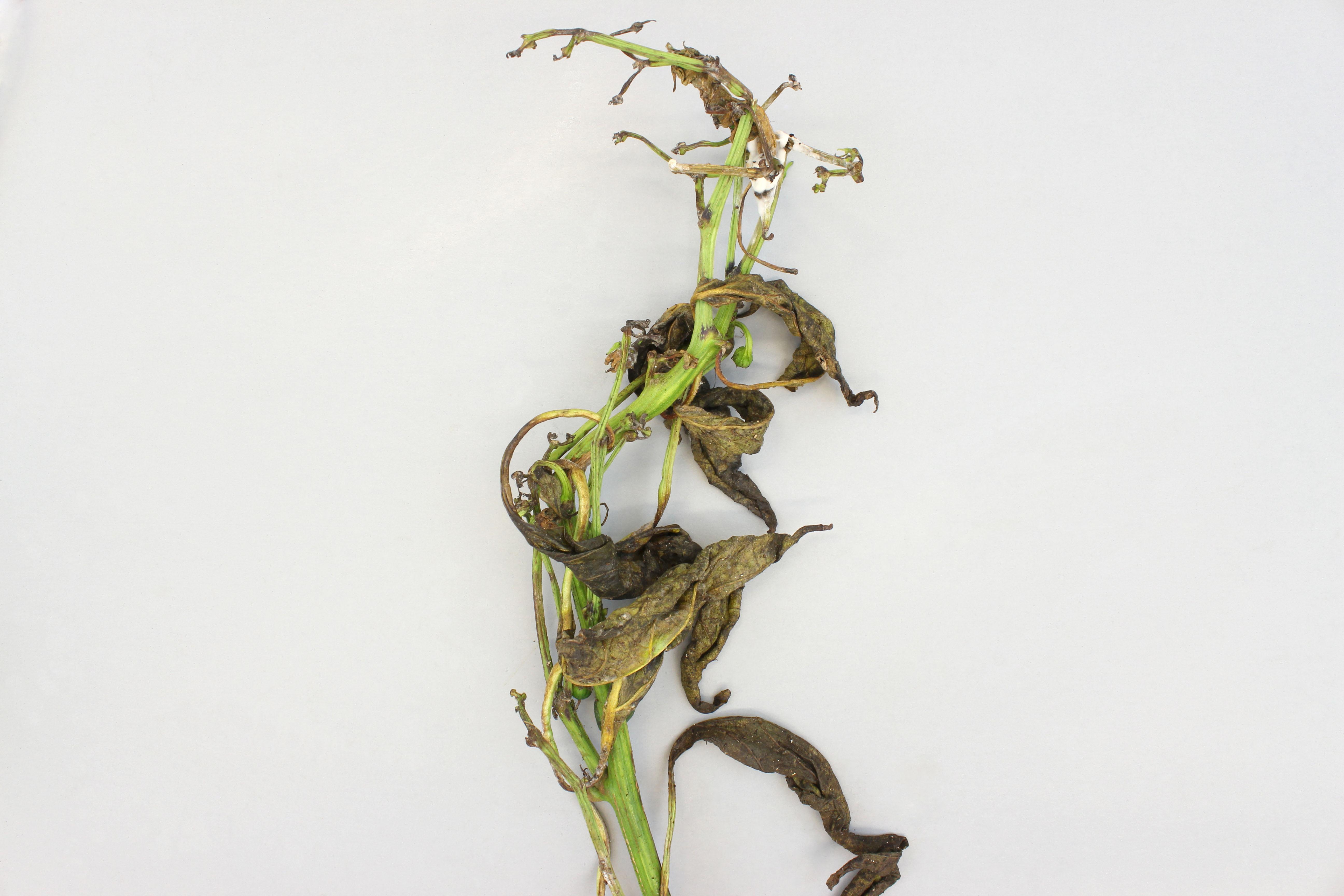 Légende: Pourriture et mycélium blanc sur tiges de poivron