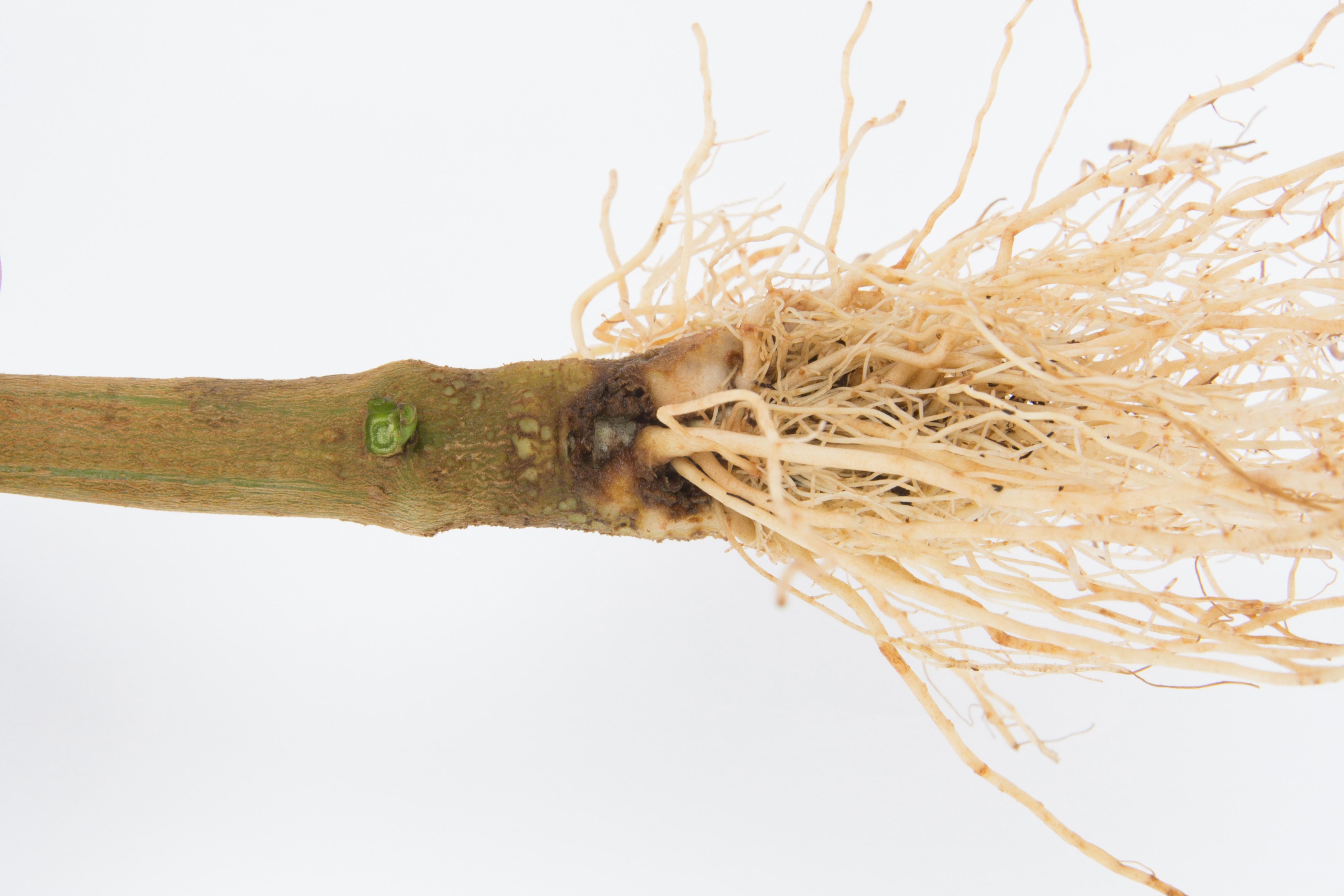 Description: La partie basale de la tige et le collet d’un plant de poivron portent un chancre brun d’une profondeur d’environ 5 mm. Les tissus internes du collet sont pourris et bruns (non visible ici). L’extrémité des racines est légèrement brune. Les jeunes feuilles sont flétries et tombent. Les tests de laboratoire ont révélé la présence de la bactérie Pectobacterium carotovorum dans le collet. Cette bactérie est responsable de la pourriture molle bactérienne chez de nombreuses plantes, dont le poivron. Notez que le champignon Pythium sp. a été isolé des racines brunes. Il est considéré ici comme un agent pathogène secondaire.