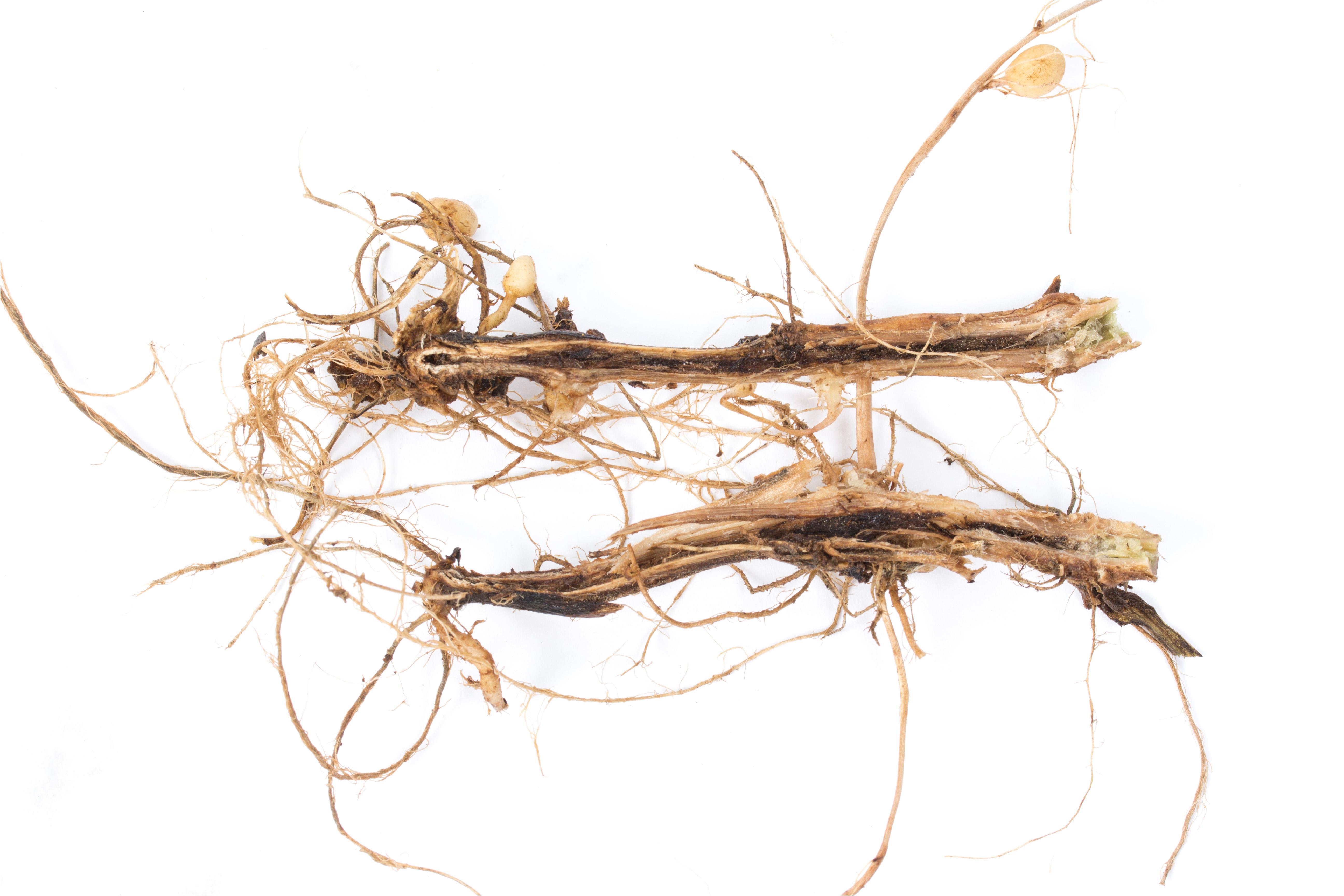 Description: Le collet et la tige d’un plant de pomme de terre portent un chancre noir. La moelle s'affaisse dans la région du chancre. Le plant était complètement flétri et brûlé. Les tests de laboratoire et de biologie moléculaire (PCR) ont révélé la présence de la bactérie Pectobacterium atrosepticum, responsable de la jambe noire chez la pomme de terre.
