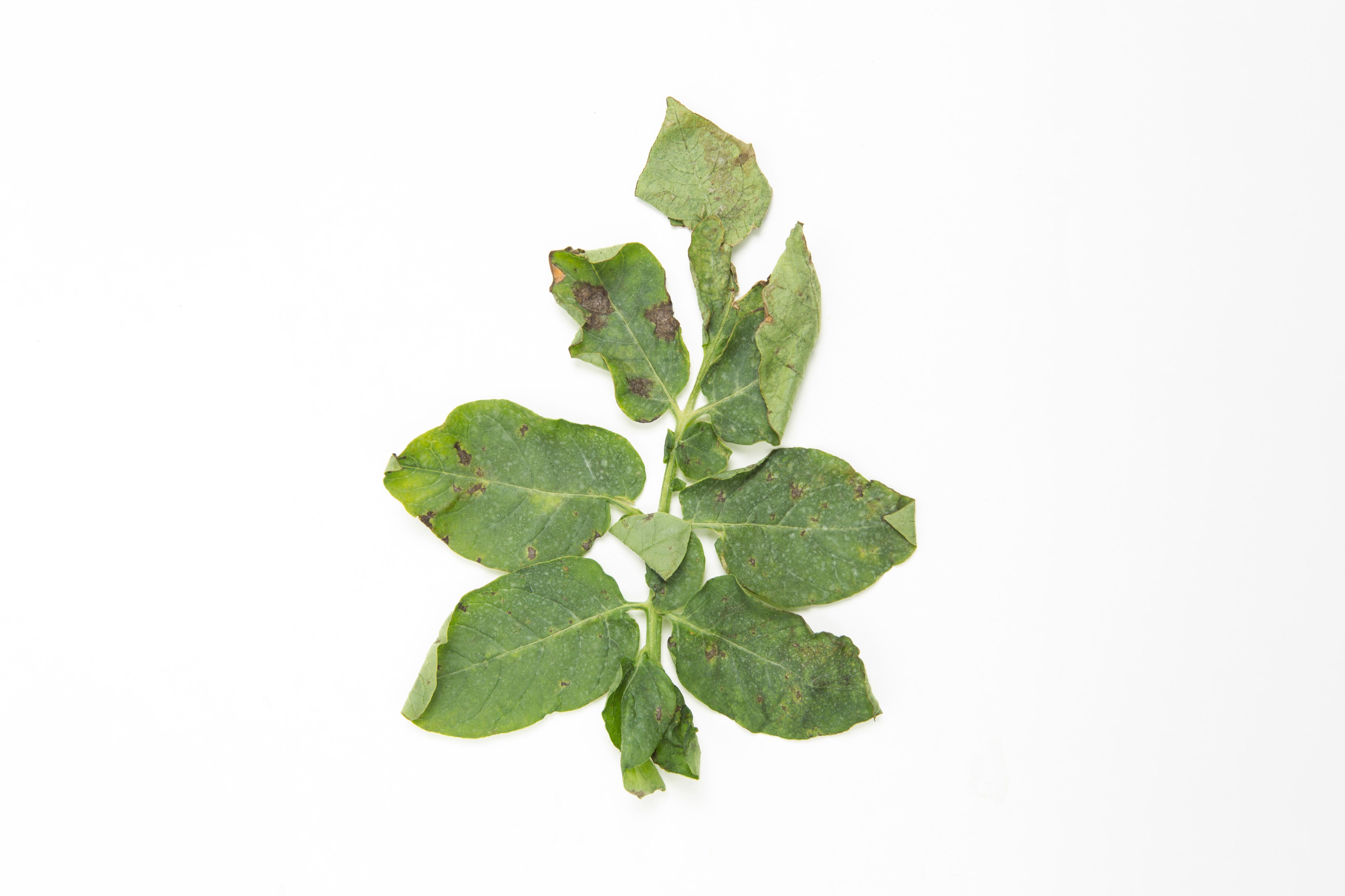 Description: Une feuille de pomme de terre montre des taches brun foncé qui traversent le limbe. Les taches sont de tailles et de dimensions variables. Certaines prennent l'apparence d’une cible. Quelques folioles portent des plages brûlées. Les tests de laboratoire ont révélé la présence du champignon Alternaria solani, responsable de la brûlure hâtive (brûlure alternarienne) chez la pomme de terre.