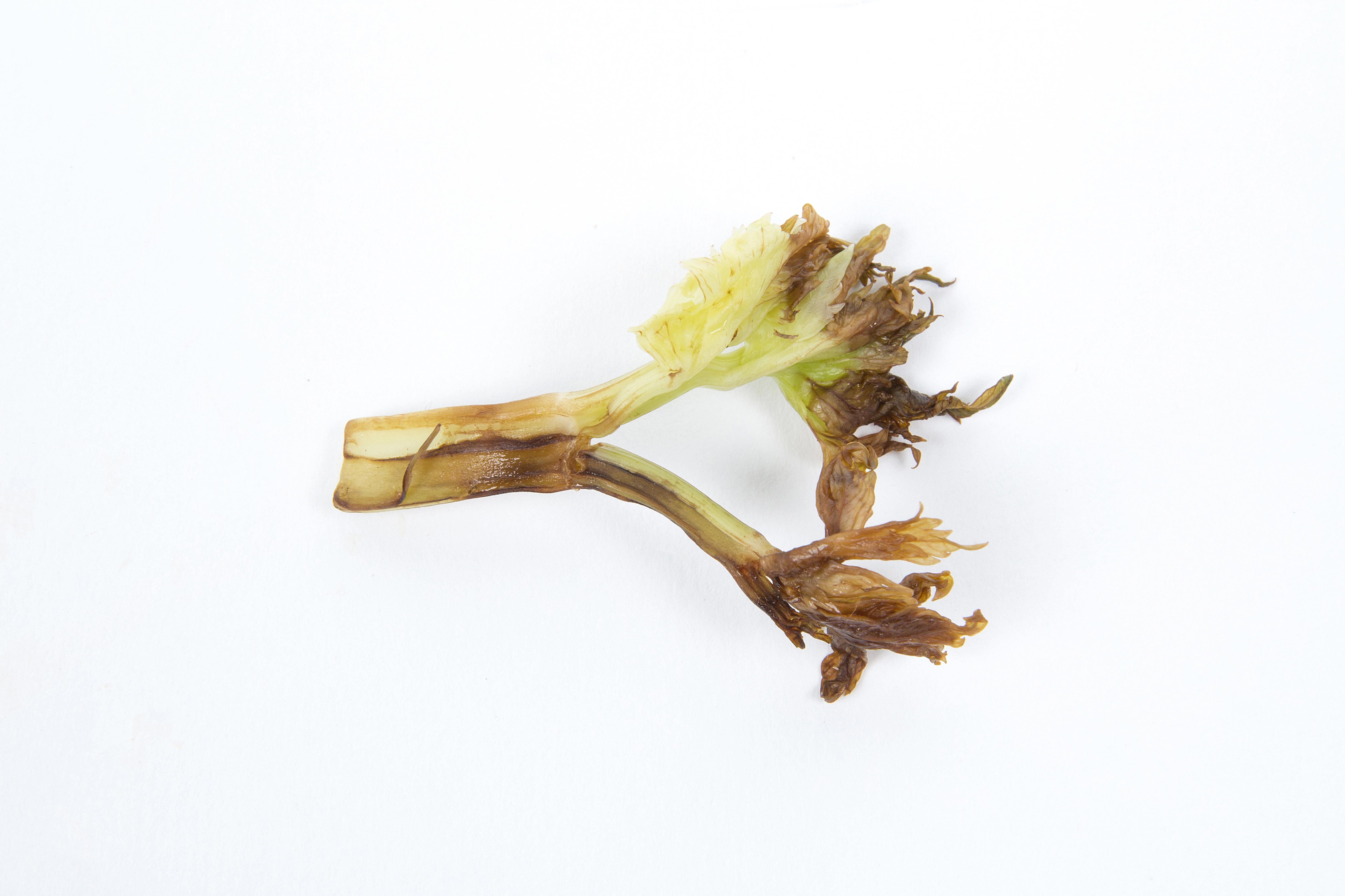 Description: Un morceau de pétiole de céleri provenant du cœur des plants montre une coloration brun-noir de l’extrémité des jeunes feuilles. Une délimitation nette sépare les tissus affectés des tissus d'apparence saine. Le pétiole est un peu tordu. Les tests de laboratoire se sont avérés négatifs pour la détection de champignon et de bactérie. Les dommages s’apparentent à ceux du cœur noir induit par une carence en calcium.   Le conseiller agricole mentionne que le céleri est cultivé sous tunnel dans un sol minéral argileux dont le drainage est mauvais. Trois fertilisations en début de saison à base de (27-0-0), (0-46-0) et (0-0-50) ont été faites. Près de 75 % des plants sont affectés. Les symptômes sont apparus soudainement (24 à 48 heures). Les stress climatiques incluent du froid puis des températures élevées et une humidité relative élevée.