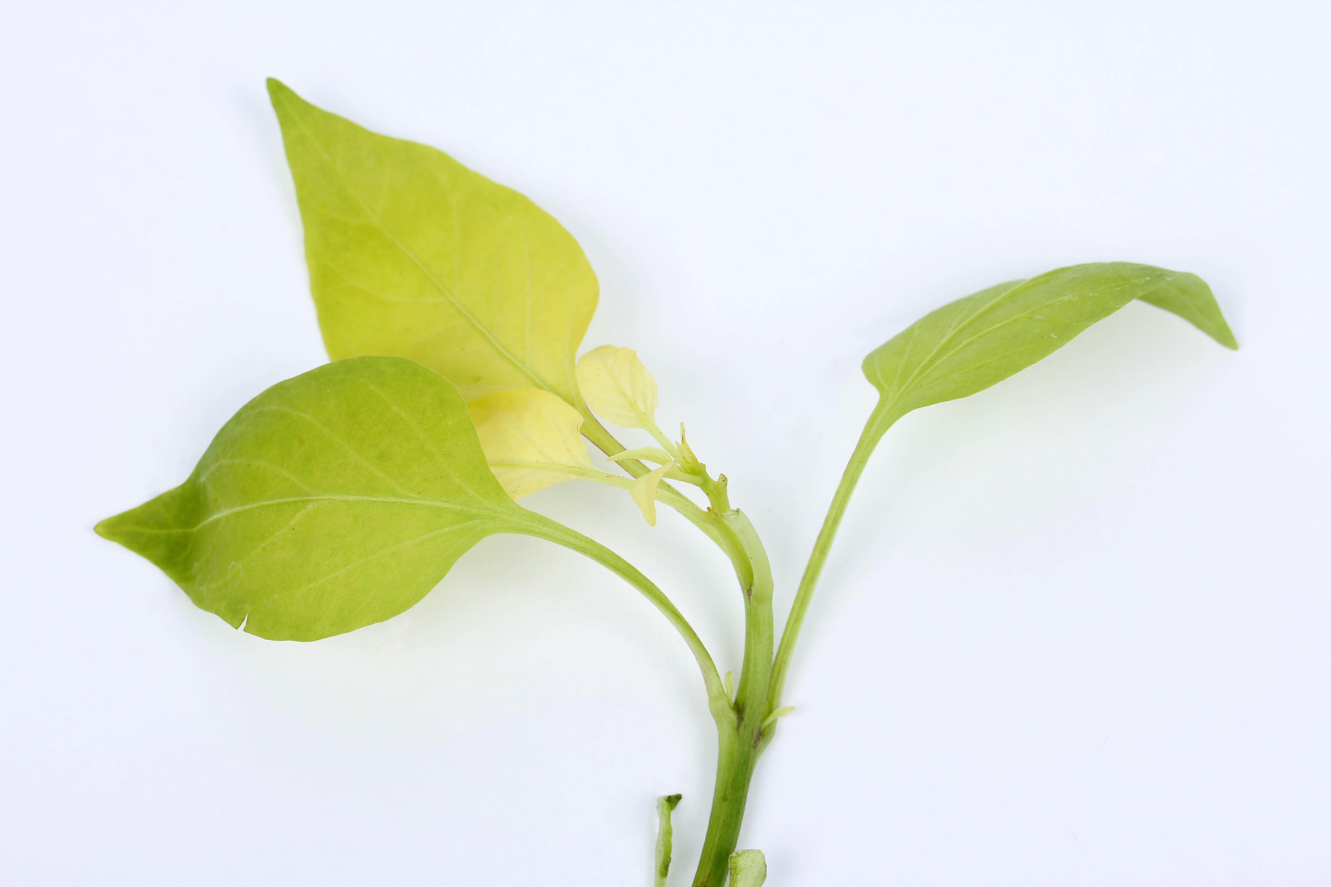 Description: Sur un jeune plant de poivron (stade 5 feuilles), les feuilles terminales et médianes présentent un jaunissement prononcé. Le jaunissement débute à la base du limbe et affecte même les nervures. Les jeunes feuilles sont les plus affectées. L’extrémité de certaines racines est brune (non visible ici). Aucun virus ni champignon racinaire n’a été détecté. Le pH (6,6) et la conductivité électrique (8,1 mS/cm) du substrat sont trop élevés. Comme 95 % de la production est atteinte, il s'agit probablement d'un problème non parasitaire. Les symptômes foliaires s’apparentent à ceux d’une carence en fer.